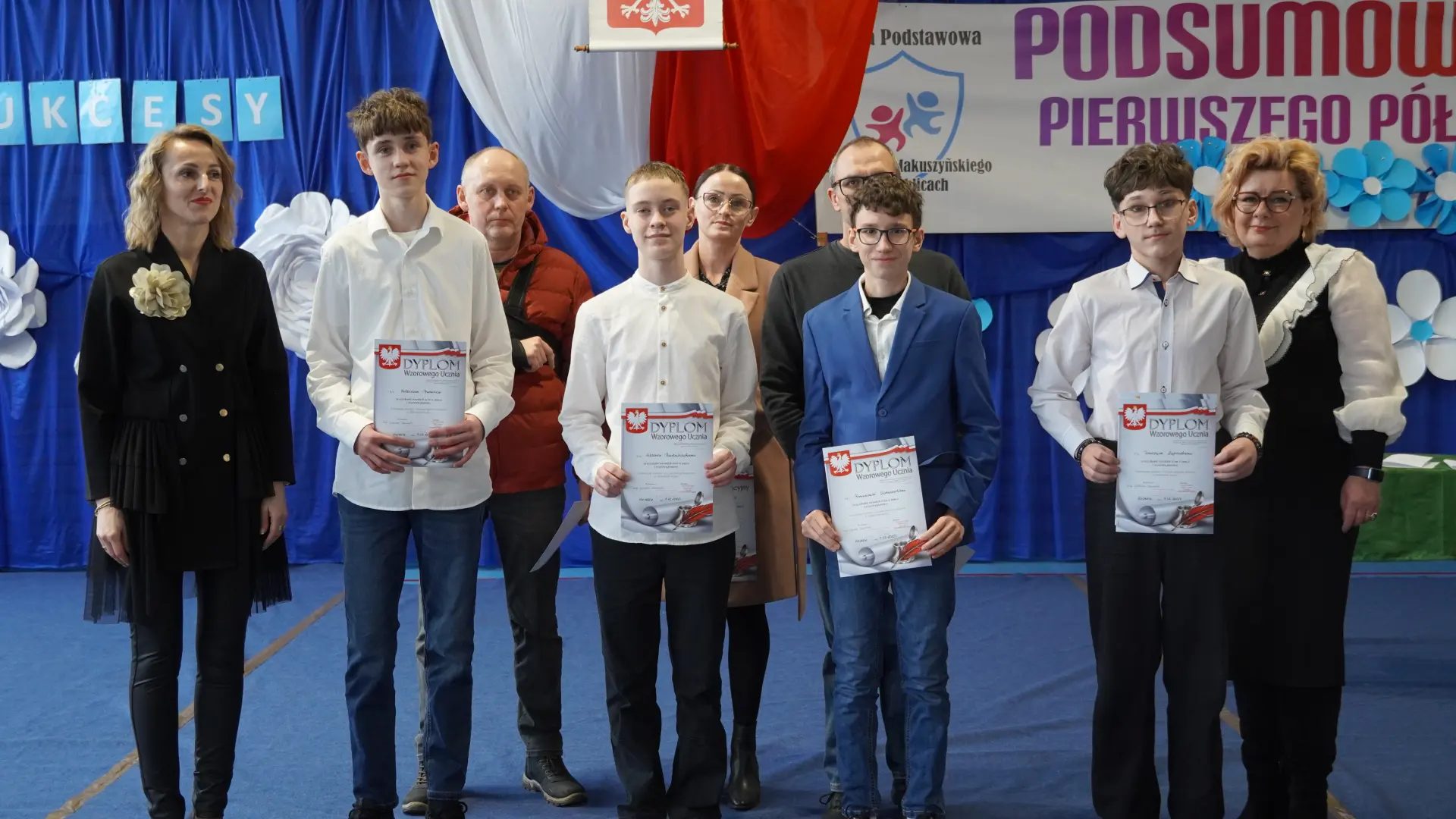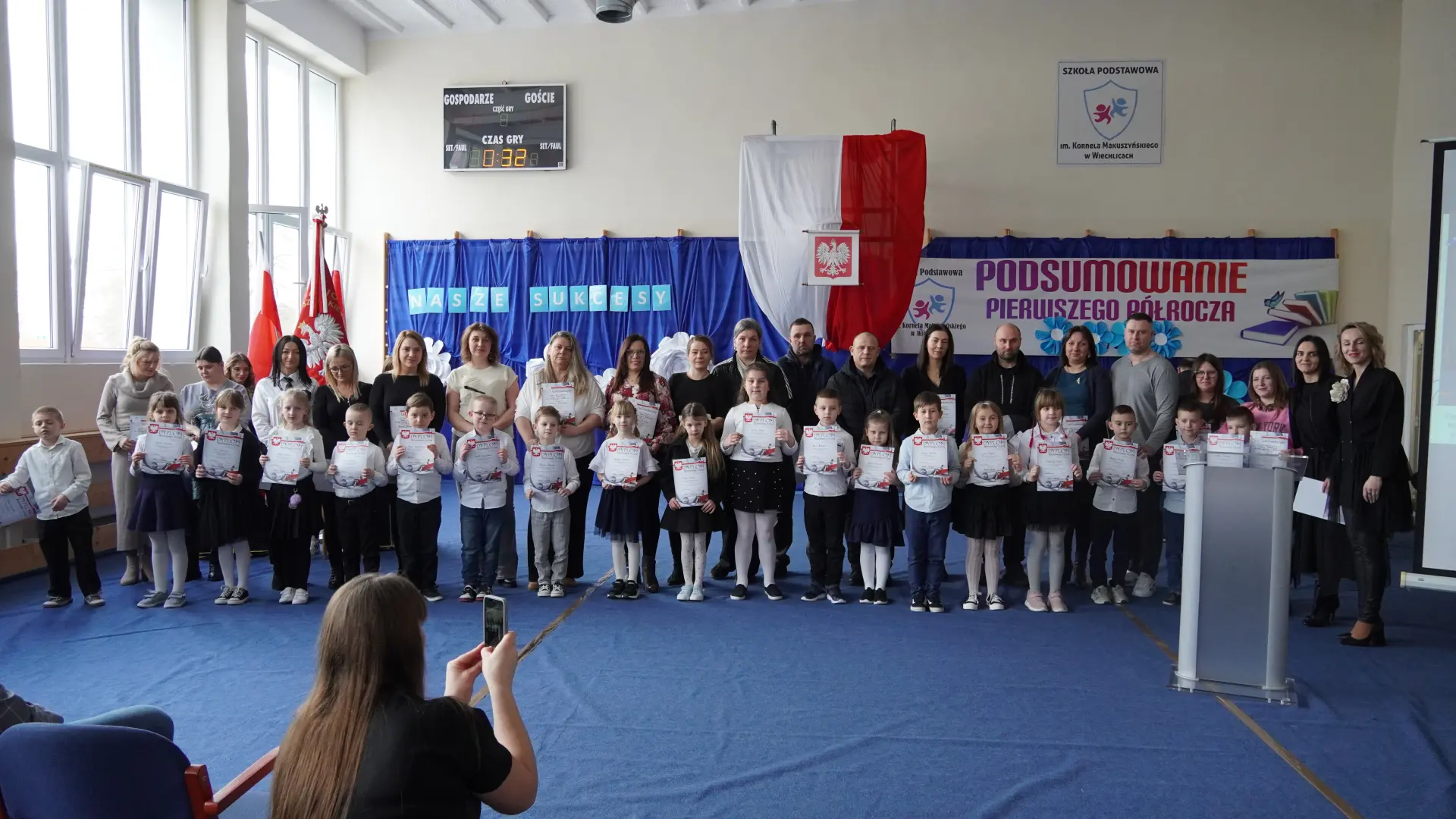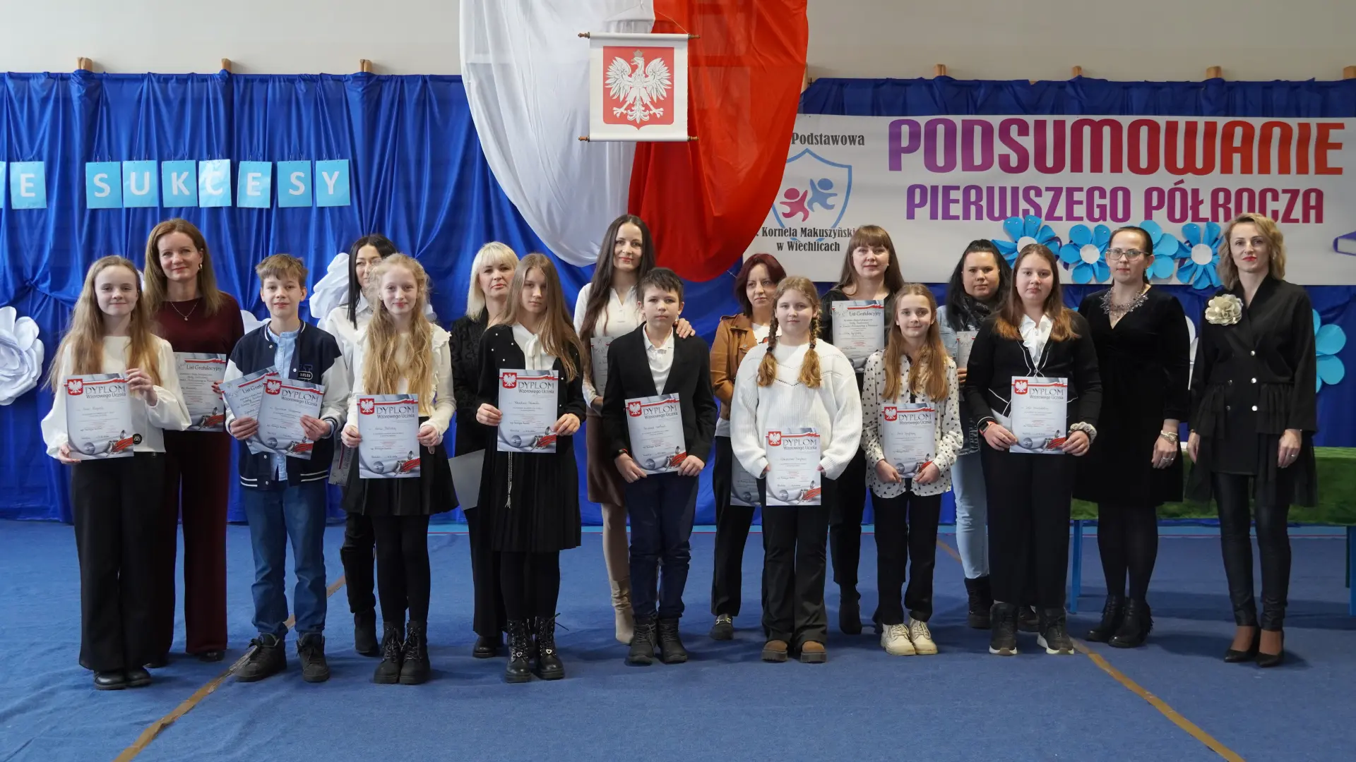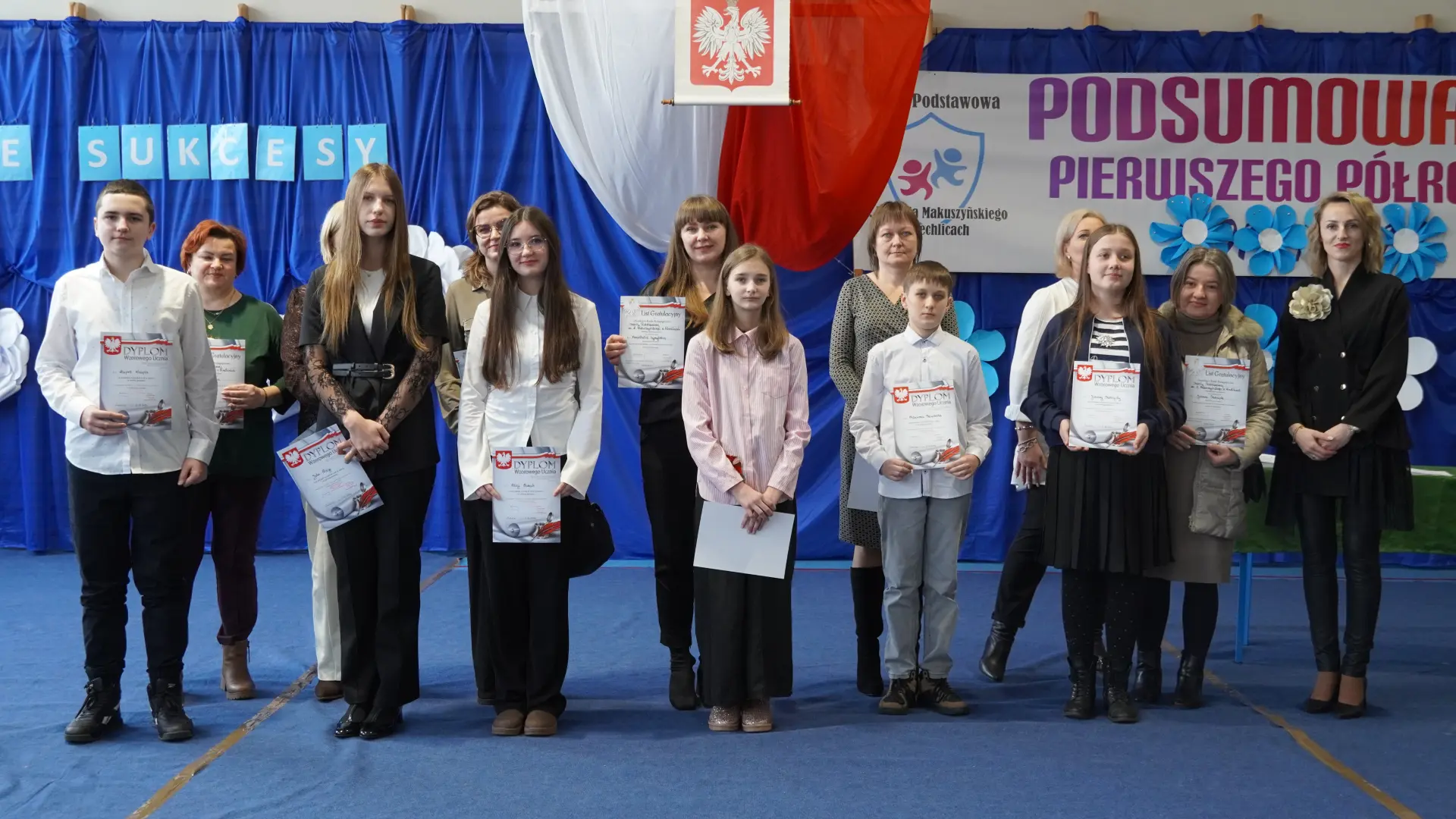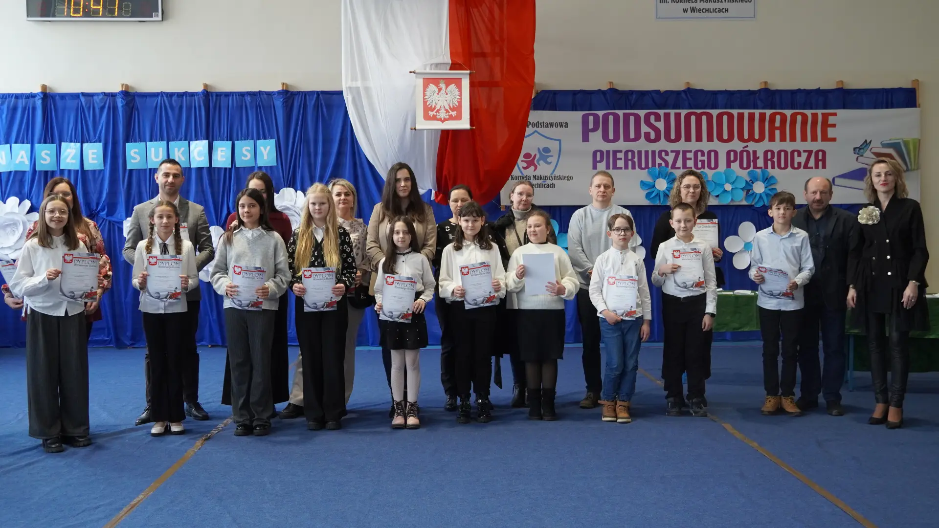Podsumowanie semestru to przede wszystkim okazja do wyróżnienia najlepszych uczniów, tj. tych, którzy osiągnęli średnią co najmniej 4,75 oraz otrzymali wzorową lub bardzo dobrą ocenę z zachowania, a także wręczenia listów gratulacyjnych ich rodzicom. W klasach I – III takie dyplomy otrzymało 56 uczniów, a w IV – VIII – 36. Dziesięcioro uczniów systematycznie uczęszczających do szkoły otrzymało dyplomy Klubu Stu. Nie mniej istotne było także zaprezentowanie wydarzeń, programów, projektów oraz sukcesów naszych uczniów, które tradycyjnie zostały omówione w prezentacji multimedialnej przez p. Annę Ciołkę.