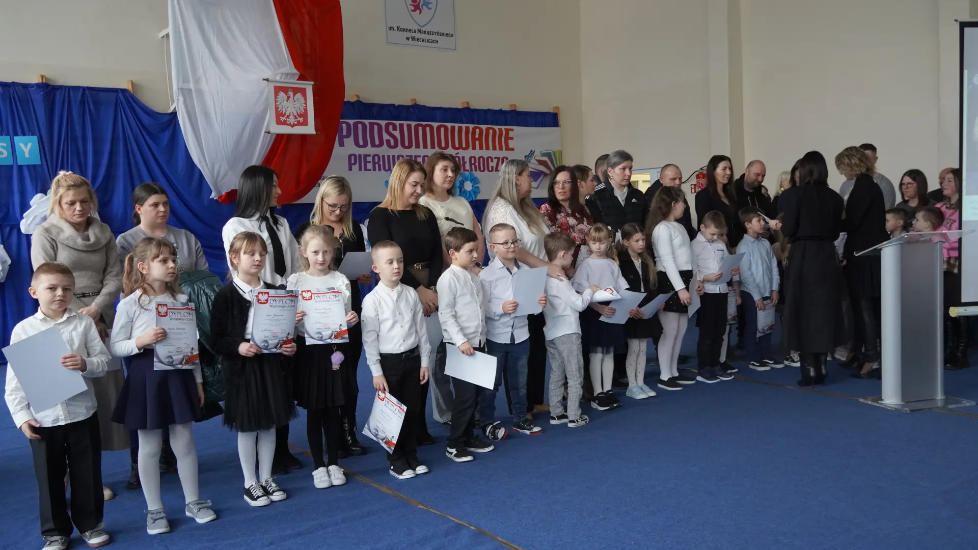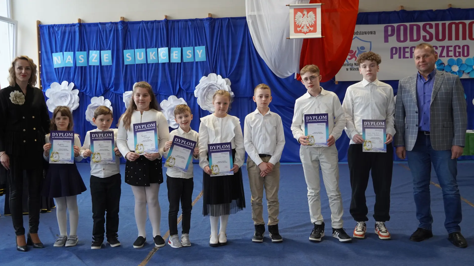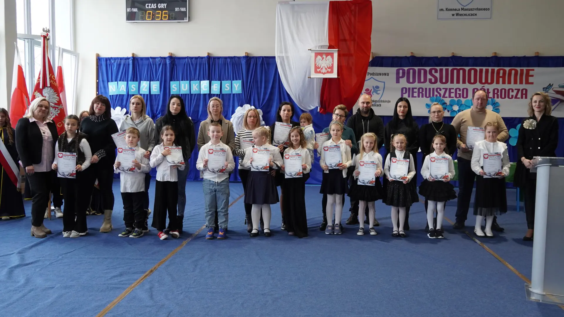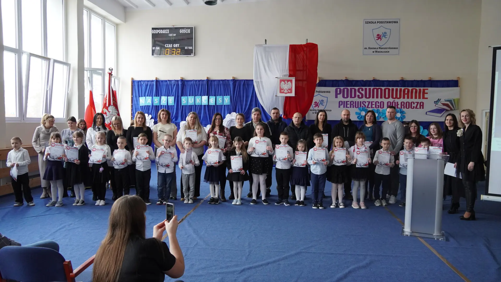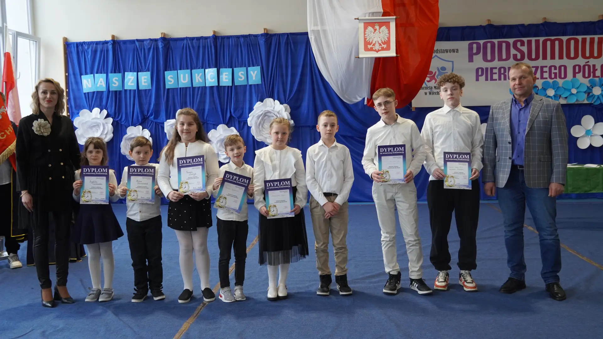 Podsumowanie semestru to przede wszystkim okazja do wyróżnienia najlepszych uczniów, tj. tych, którzy osiągnęli średnią co najmniej 4,75 oraz otrzymali wzorową lub bardzo dobrą ocenę z zachowania, a także wręczenia listów gratulacyjnych ich rodzicom. W klasach I – III takie dyplomy otrzymało 56 uczniów, a w IV – VIII – 36. Dziesięcioro uczniów systematycznie uczęszczających do szkoły otrzymało dyplomy Klubu Stu. Nie mniej istotne było także zaprezentowanie wydarzeń, programów, projektów oraz sukcesów naszych uczniów, które tradycyjnie zostały omówione w prezentacji multimedialnej przez p. Annę Ciołkę.
