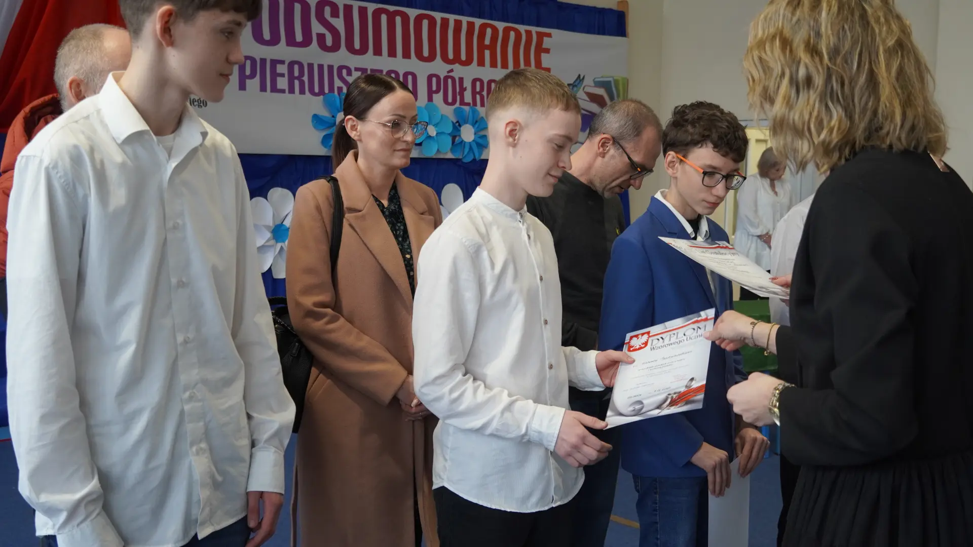 Podczas apelu podsumowującego pracę szkoły w I semestrze roku szkolnego 2025/2026 wręczono dyplomy wzorowego ucznia oraz wyróżniono uczniów ze 100 – procentową frekwencją.