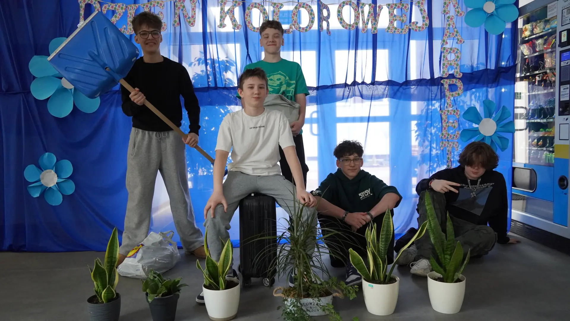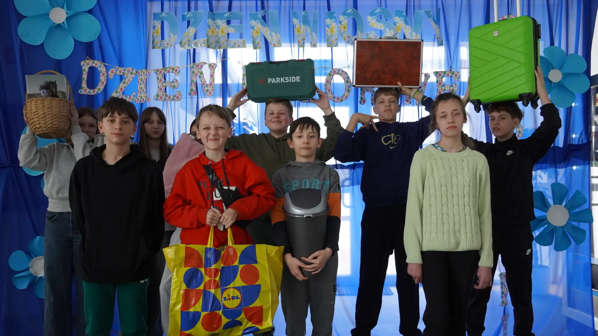 Powitanie wiosny jest zawsze bardzo radosnym dniem w naszej szkole. Cieszą się zwłaszcza uczniowie, którzy tego dnia nie są pytani i mogą wykazać się bogatą wyobraźnią i kreatywnością. By tradycji stało się zadość przynieśli i w tym roku swoje zeszyty i książki w oryginalnych plecakach. Były taczki, transporterki dla zwierząt, odkurzacze, walizki, pojemniki na narzędzia i wiele innych. Podczas Pierwszego Dnia Wiosny nie zapomnieliśmy o "Międzynarodowym Dniu Osób z Zespołem Downa" przychodząc w kolorowych skarpetkach. Był też korowód klas I - III, a uczniowie ubrani w kolorach wiosny, czyli na zielono, zrobili sobie pamiątkowe zdjęcia. Najbardziej zaangażowani nie tylko świetnie się bawili, ale także otrzymali dodatnie punkty za stworzenie wiosennej atmosfery.