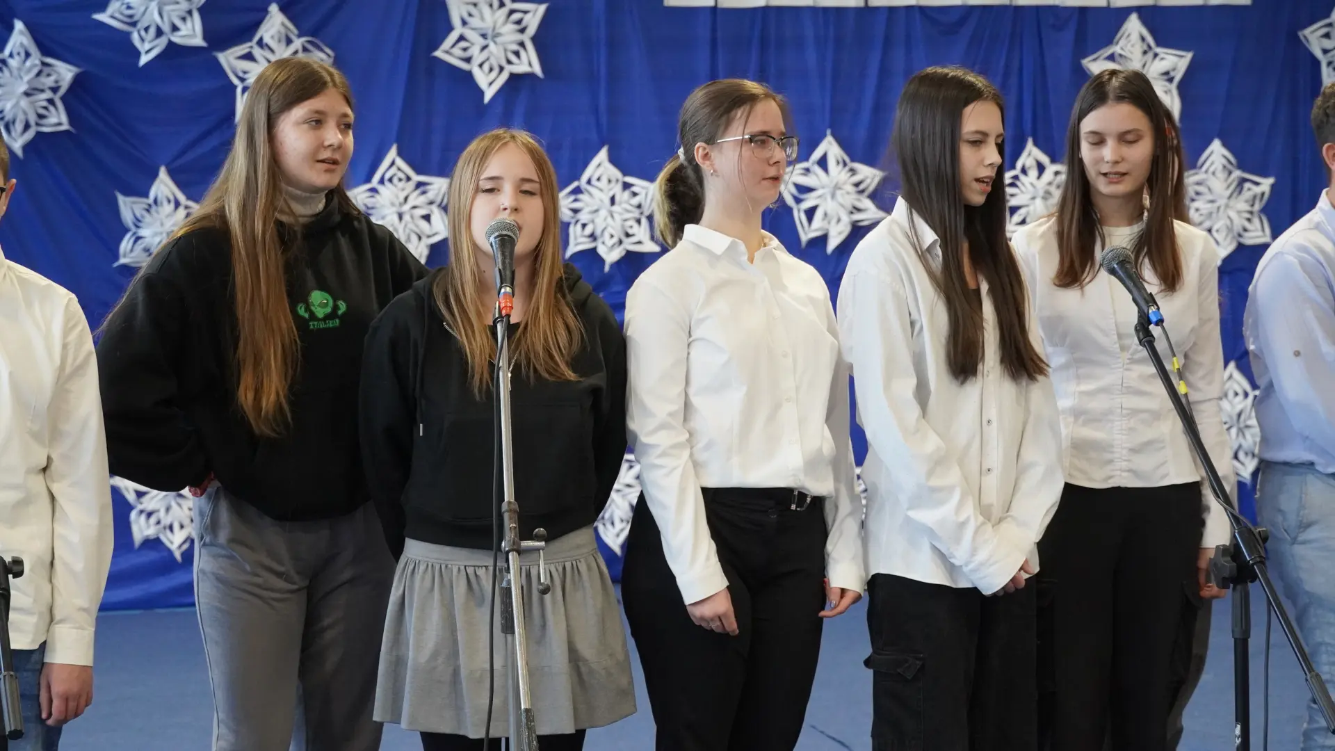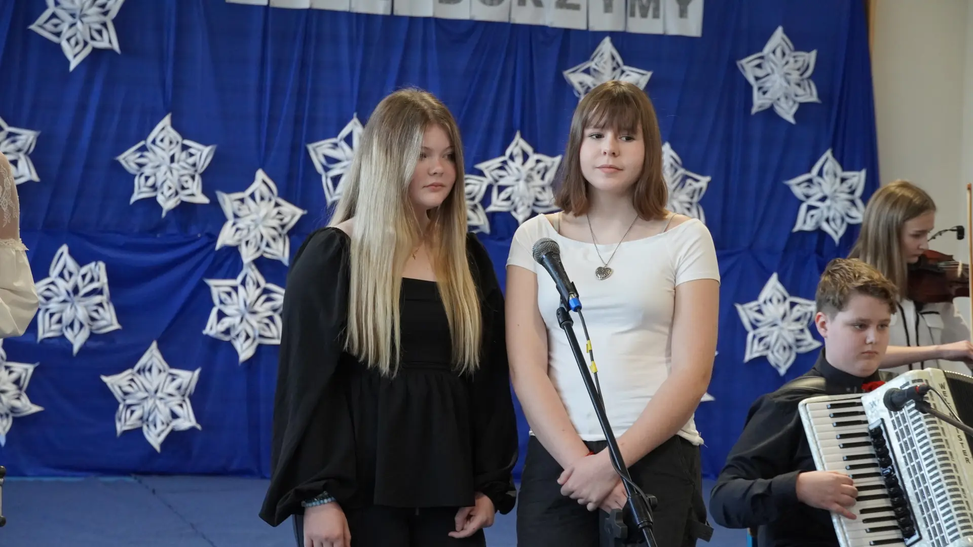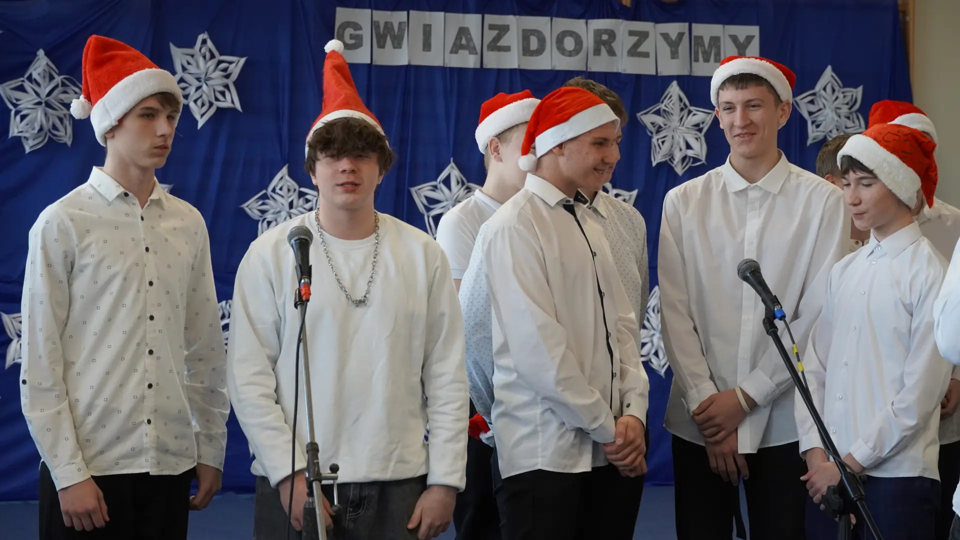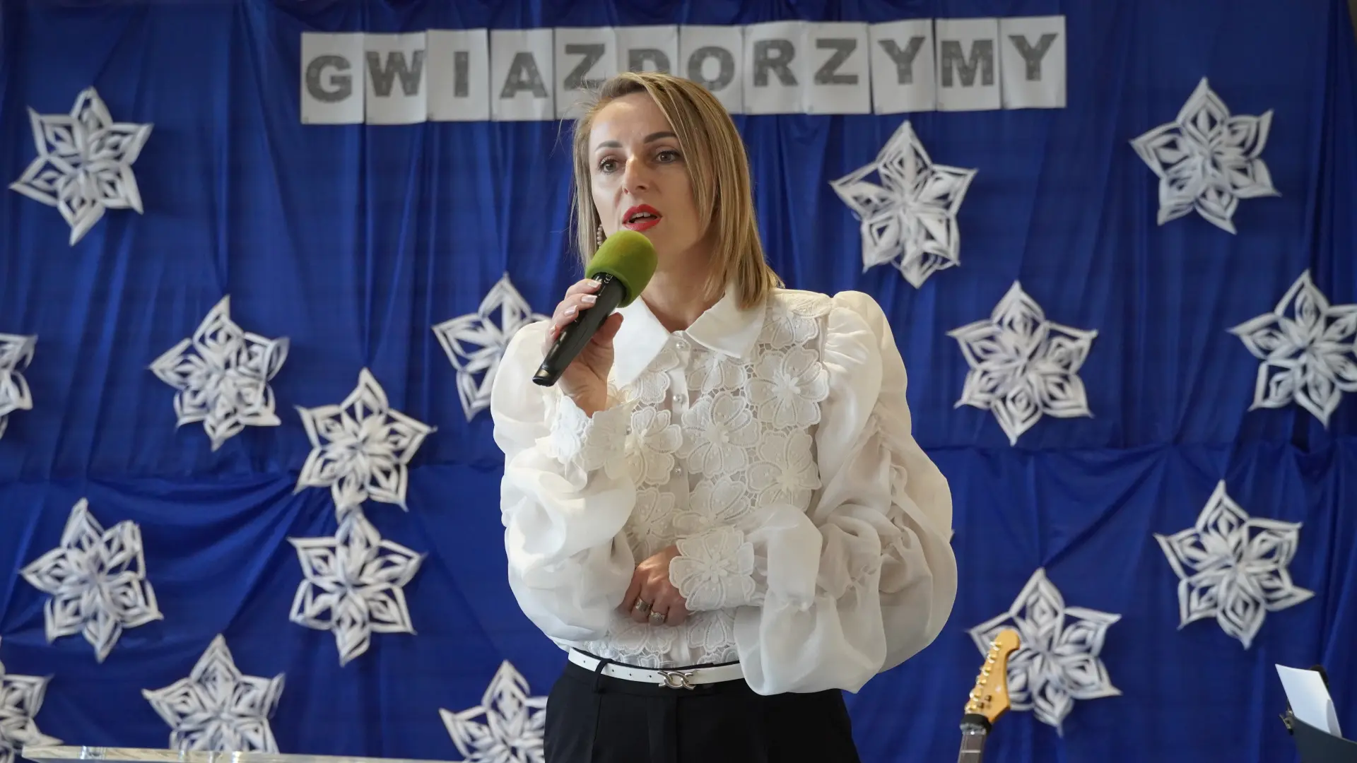Uroczystość wzbogaciły również występy zaprzyjaźnionych zespołów: Dojrzałe Kłosy oraz Magdalenki, które zachwyciły publiczność swoim świątecznym repertuarem. Choć za oknem brak zimowej aury, w murach szkoły zapanował prawdziwie bożonarodzeniowy klimat. Na zakończenie głos zabrała pani Sylwia Suszko, składając świąteczne życzenia uczniom, nauczycielom, pracownikom szkoły oraz zaproszonym gościom. Finałem apelu było rozstrzygnięcie konkursów świątecznych i wręczenie nagród.