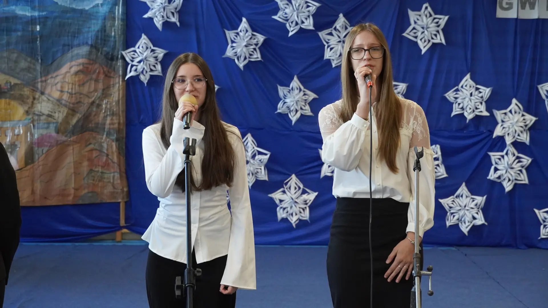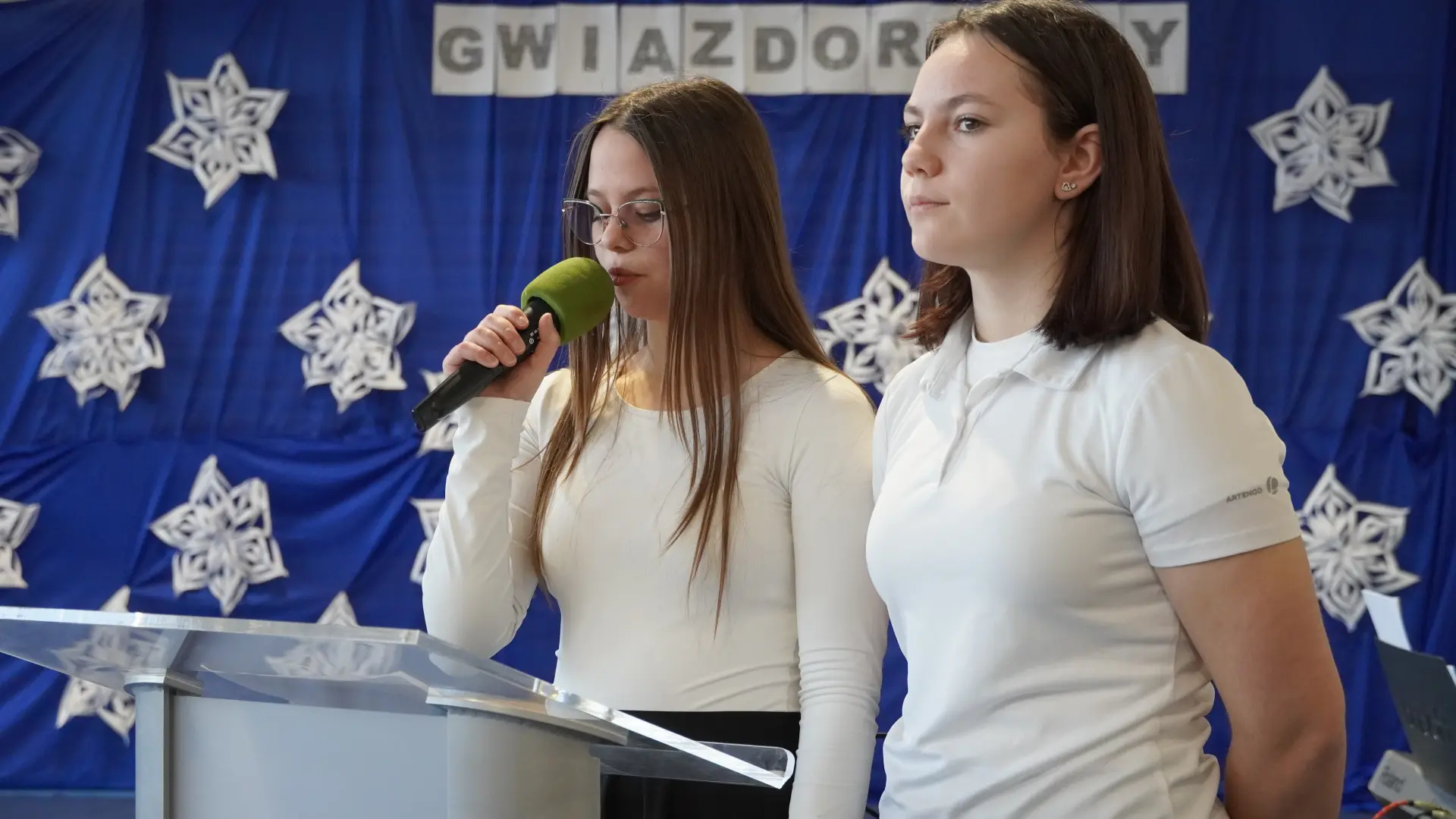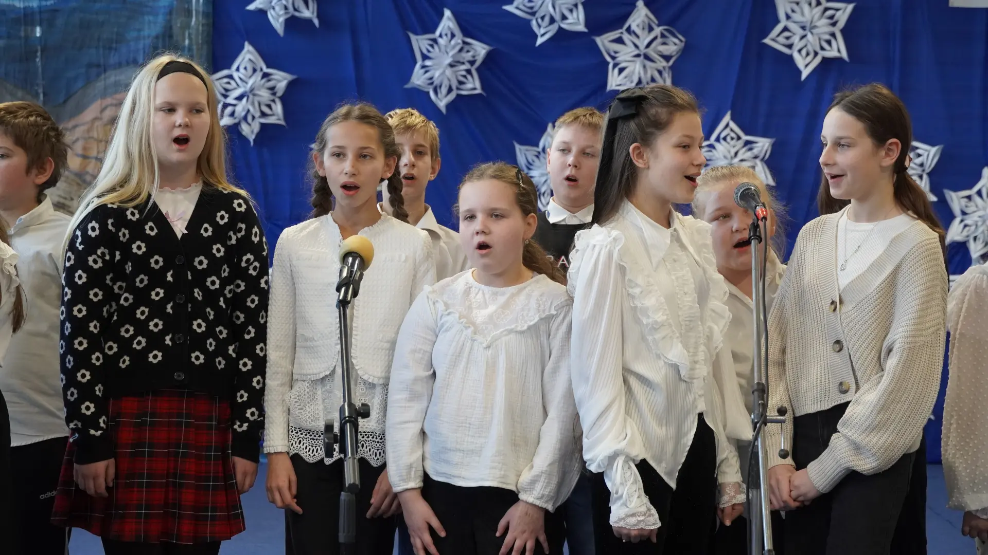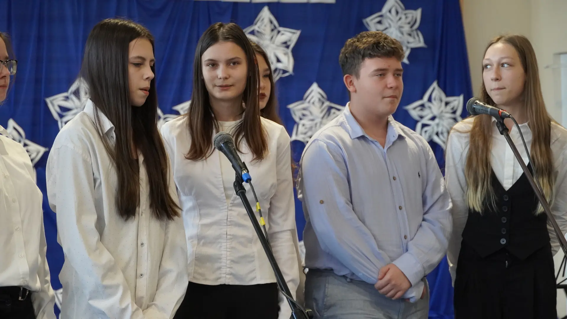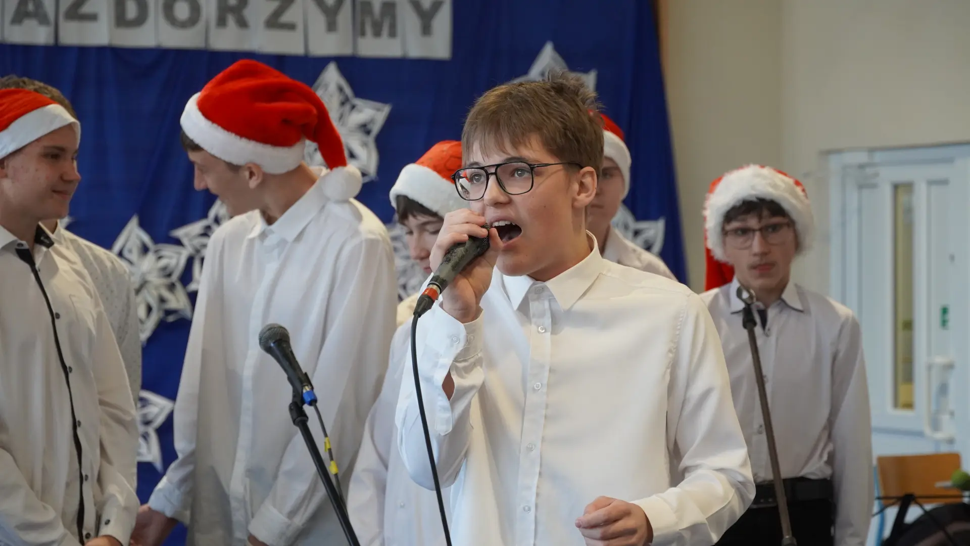 Uroczystość wzbogaciły również występy zaprzyjaźnionych zespołów: Dojrzałe Kłosy oraz Magdalenki, które zachwyciły publiczność swoim świątecznym repertuarem. Choć za oknem brak zimowej aury, w murach szkoły zapanował prawdziwie bożonarodzeniowy klimat. Na zakończenie głos zabrała pani Sylwia Suszko, składając świąteczne życzenia uczniom, nauczycielom, pracownikom szkoły oraz zaproszonym gościom. Finałem apelu było rozstrzygnięcie konkursów świątecznych i wręczenie nagród.