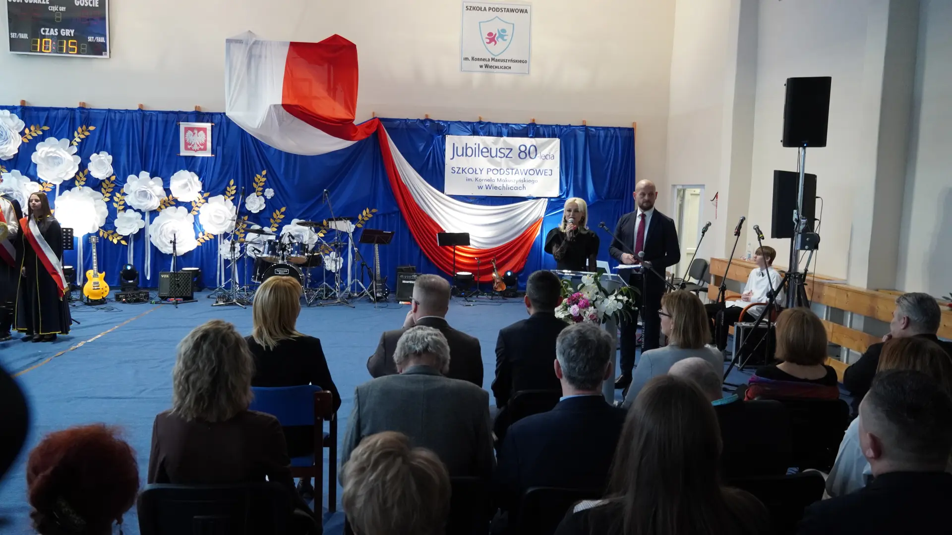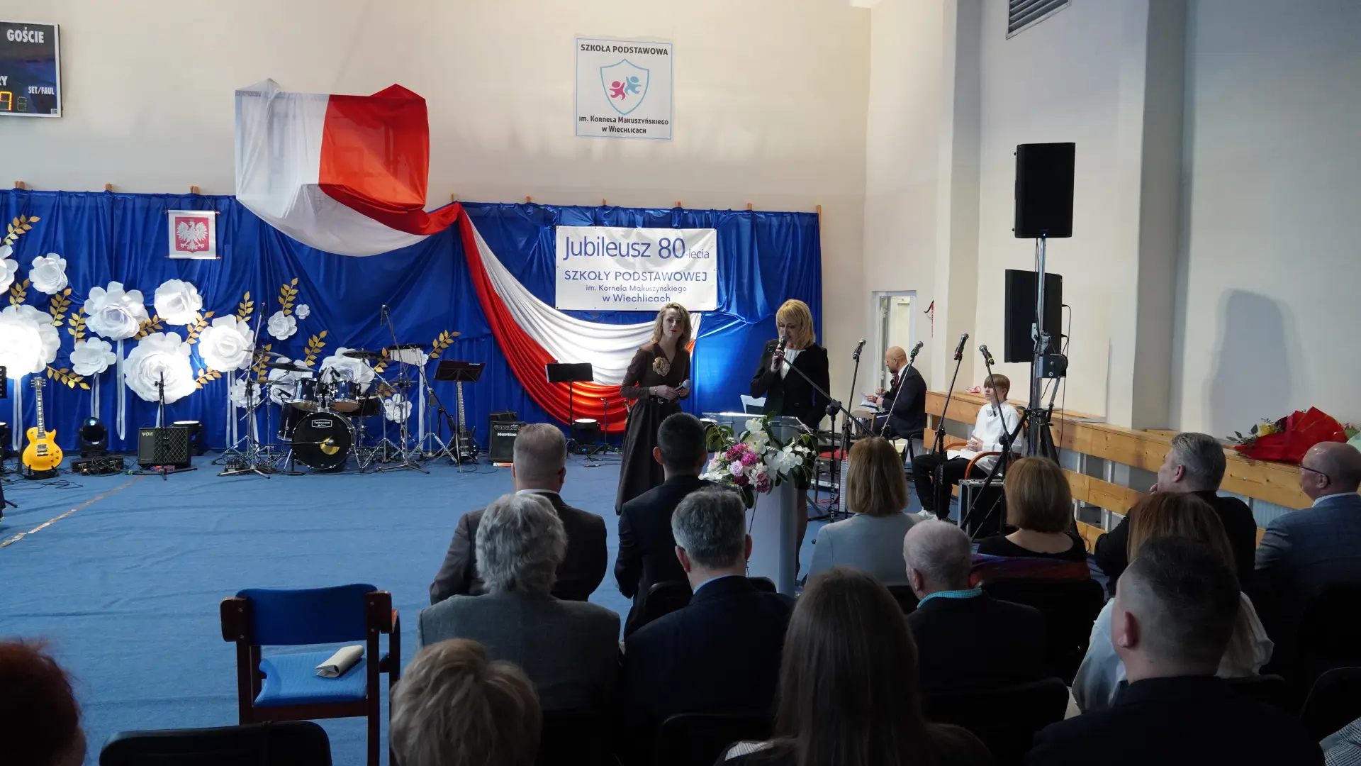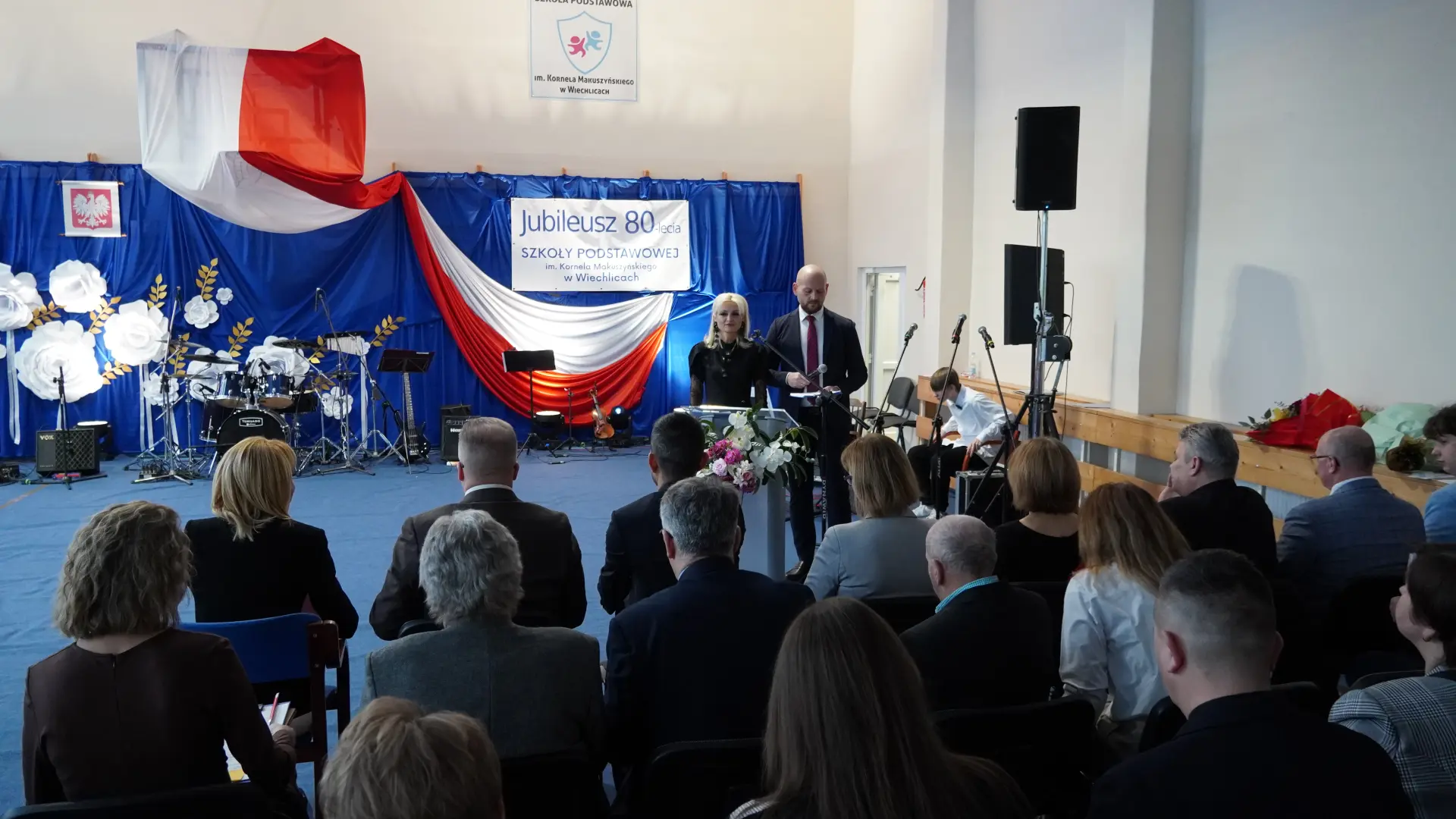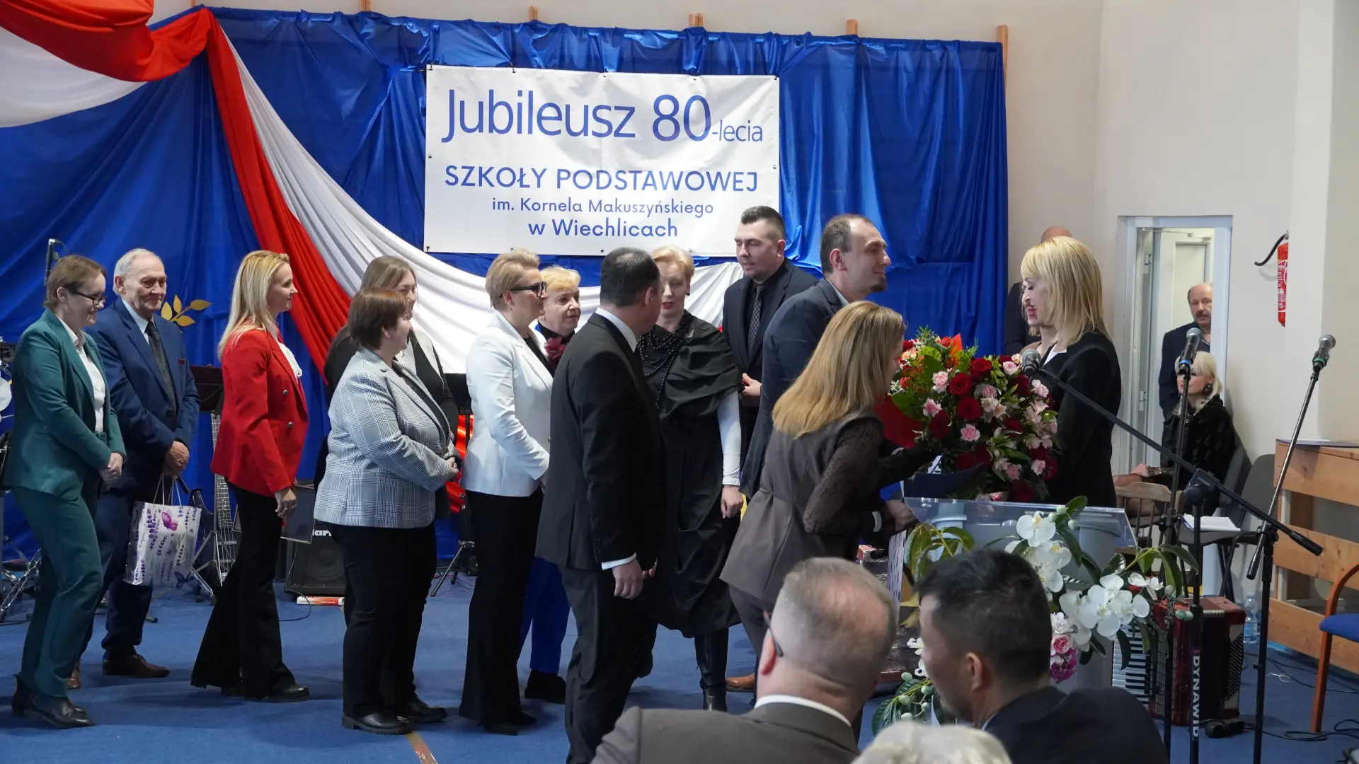 Uroczystość, która była niezwykłym przeżyciem dla nauczycieli, pracowników, emerytów, uczniów, absolwentów i rodziców uświetnili zaproszeni goście, od których na ręce dyrektora szkoły, Cecylii Brodzińskiej, popłynęły życzenia i gratulacje. Swoją obecnością zaszczycili nas m.in. P. Mirosław Gąsik- burmistrz Szprotawy, P. Dorota Grzeszczak - wiceburmistrz Szprotawy, p. Halina Sawa- wiceprzewodnicząca Rady Miejskiej w Szprotawie, p. Stanisław Tomczyszyn - Poseł na Sejm RP, p. Maciej Siwivki - I Wicewojewoda Lubuski, p. Marzena Pulik - Sowińska - Lubuski Wicekurator Oświaty, p. Paweł Giza - Radny Sejmiku Województwa Lubuskiego. Dyrektor w swoim przemówieniu zwróciła się do byłych pracowników i nauczycieli, byłej kadry kierowniczej, absolwentów, uczniów, rodziców, pracowników i nauczycieli aktualnie pracujących, dziękując za ogromny wysiłek na przestrzeni lat, ale także za wszystkie osiągnięcia. Podziękowała również Panu i Pani Burmistrz, Kuratorium Oświaty, samorządowcom, przyjaciołom szkoły i wszystkim instytucjom wspierającym naszą placówkę. W imieniu absolwentów do zebranych zwróciła się P. Sylwia Suszko - absolwentka, a obecnie wicedyrektor szkoły. Ale najbardziej serca wszystkich zostały poruszone przez muzykę. Prowadzący galę – p. Anna Ciołka oraz p. Jacek Druciarek, podzielili historię szkoły na dekady począwszy od lat pięćdziesiątych. W każdej z nich prezentowane były utwory muzyczne typowe dla danego okresu. Wybrzmiały więc: ” Krakowski splean”, „Budujemy nowy most”, „Kroplą deszczu”, Metalica”, „Zawsze niech będzie słońce” czy „Barka”. Oprawę muzyczną gali zapewnił p. Krzysztof Boczniewicz wraz z prowadzonym przez niego zespołem „ZRZ” składającym się z uczniów i naszych absolwentów oraz z zespołem muzycznym istniejącym obecnie w szkole. Podczas uroczystości było kilka niespodzianek. Zaskoczeniem było spontaniczne zaśpiewanie przez byłych członków zespołu „Fajna Ferajna” oraz członków innych grup muzycznych działających na przestrzeni lat w SP Wiechlice utworu „Z tamtej strony jeziora”, wtapianie się strojem w poszczególne dekady przez prowadzącą uroczystość oraz poprowadzenie części gali przez p. Macieja Siwickiego, nauczyciela szkoły, a obecnie I Wicewojewody Lubuskiego.