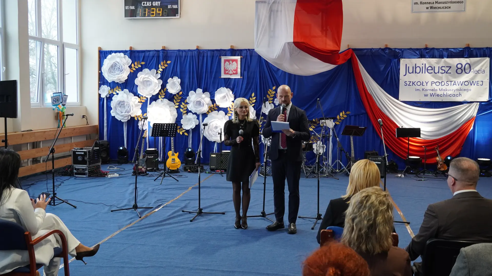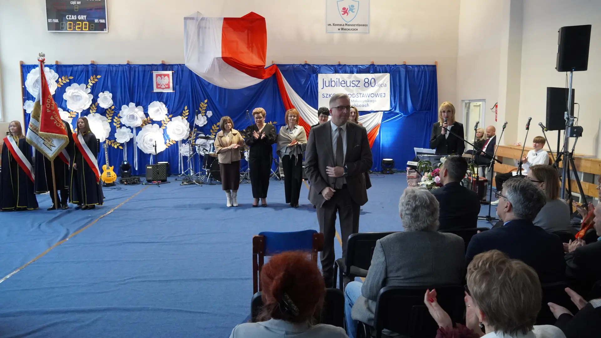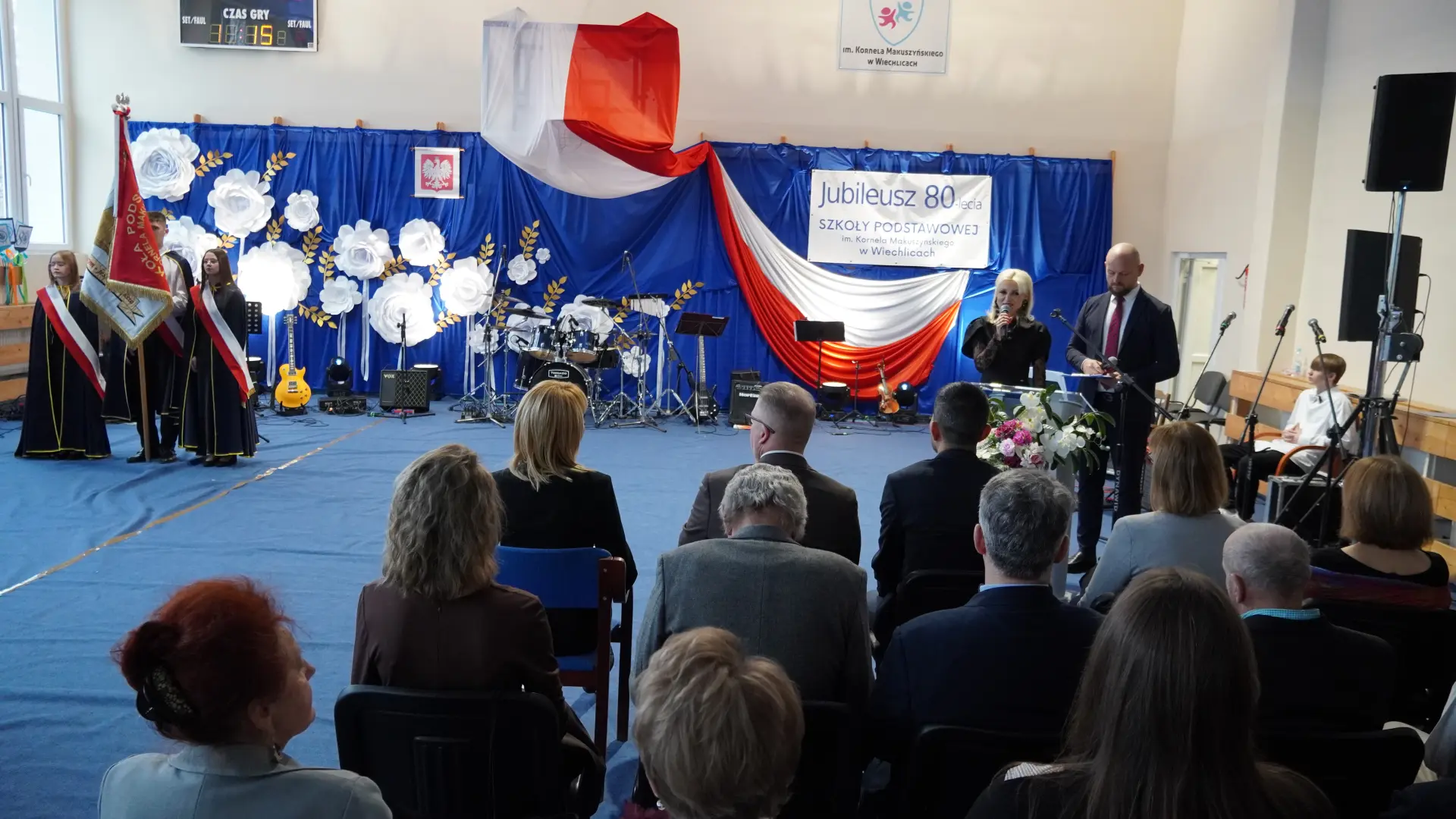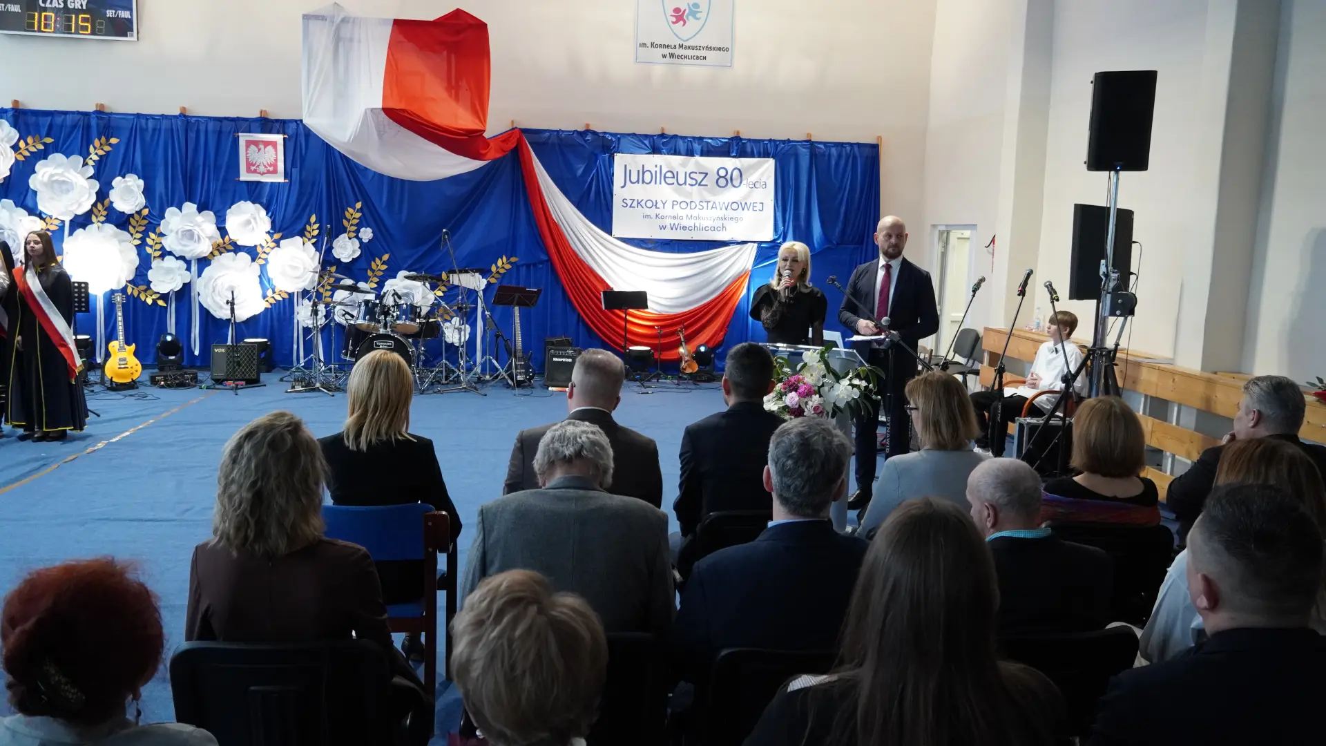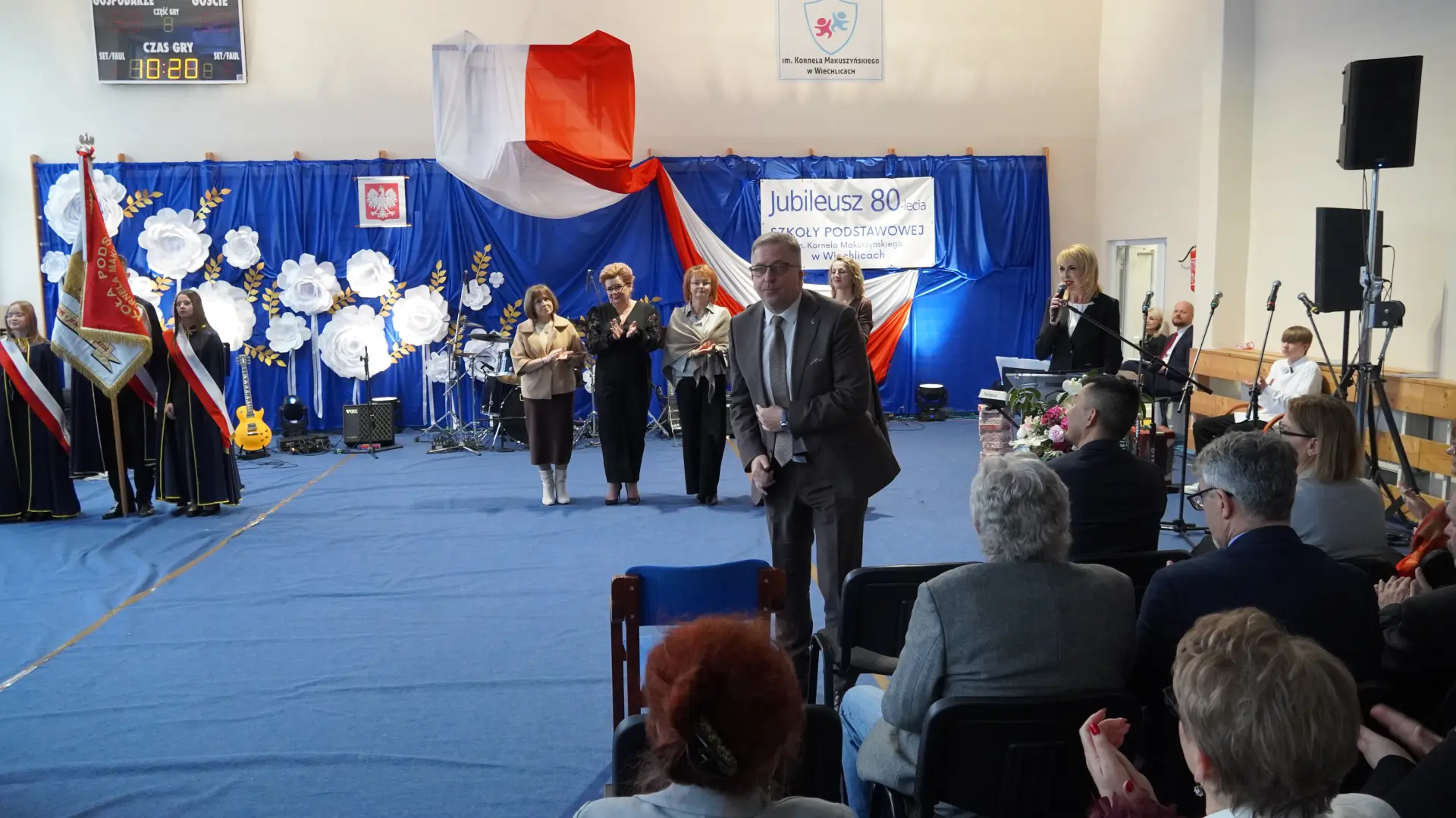 Uroczystość, która była niezwykłym przeżyciem dla nauczycieli, pracowników, emerytów, uczniów, absolwentów i rodziców uświetnili zaproszeni goście, od których na ręce dyrektora szkoły, Cecylii Brodzińskiej, popłynęły życzenia i gratulacje. Swoją obecnością zaszczycili nas m.in. P. Mirosław Gąsik- burmistrz Szprotawy, P. Dorota Grzeszczak - wiceburmistrz Szprotawy, p. Halina Sawa- wiceprzewodnicząca Rady Miejskiej w Szprotawie, p. Stanisław Tomczyszyn - Poseł na Sejm RP, p. Maciej Siwivki - I Wicewojewoda Lubuski, p. Marzena Pulik - Sowińska - Lubuski Wicekurator Oświaty, p. Paweł Giza - Radny Sejmiku Województwa Lubuskiego. Dyrektor w swoim przemówieniu zwróciła się do byłych pracowników i nauczycieli, byłej kadry kierowniczej, absolwentów, uczniów, rodziców, pracowników i nauczycieli aktualnie pracujących, dziękując za ogromny wysiłek na przestrzeni lat, ale także za wszystkie osiągnięcia. Podziękowała również Panu i Pani Burmistrz, Kuratorium Oświaty, samorządowcom, przyjaciołom szkoły i wszystkim instytucjom wspierającym naszą placówkę. W imieniu absolwentów do zebranych zwróciła się P. Sylwia Suszko - absolwentka, a obecnie wicedyrektor szkoły. Ale najbardziej serca wszystkich zostały poruszone przez muzykę. Prowadzący galę – p. Anna Ciołka oraz p. Jacek Druciarek, podzielili historię szkoły na dekady począwszy od lat pięćdziesiątych. W każdej z nich prezentowane były utwory muzyczne typowe dla danego okresu. Wybrzmiały więc: ” Krakowski splean”, „Budujemy nowy most”, „Kroplą deszczu”, Metalica”, „Zawsze niech będzie słońce” czy „Barka”. Oprawę muzyczną gali zapewnił p. Krzysztof Boczniewicz wraz z prowadzonym przez niego zespołem „ZRZ” składającym się z uczniów i naszych absolwentów oraz z zespołem muzycznym istniejącym obecnie w szkole. Podczas uroczystości było kilka niespodzianek. Zaskoczeniem było spontaniczne zaśpiewanie przez byłych członków zespołu „Fajna Ferajna” oraz członków innych grup muzycznych działających na przestrzeni lat w SP Wiechlice utworu „Z tamtej strony jeziora”, wtapianie się strojem w poszczególne dekady przez prowadzącą uroczystość oraz poprowadzenie części gali przez p. Macieja Siwickiego, nauczyciela szkoły, a obecnie I Wicewojewody Lubuskiego.