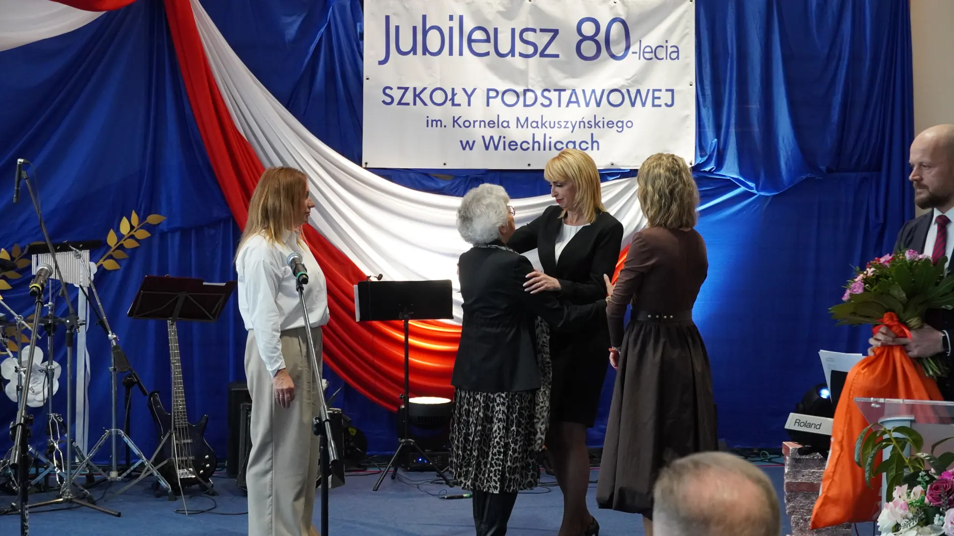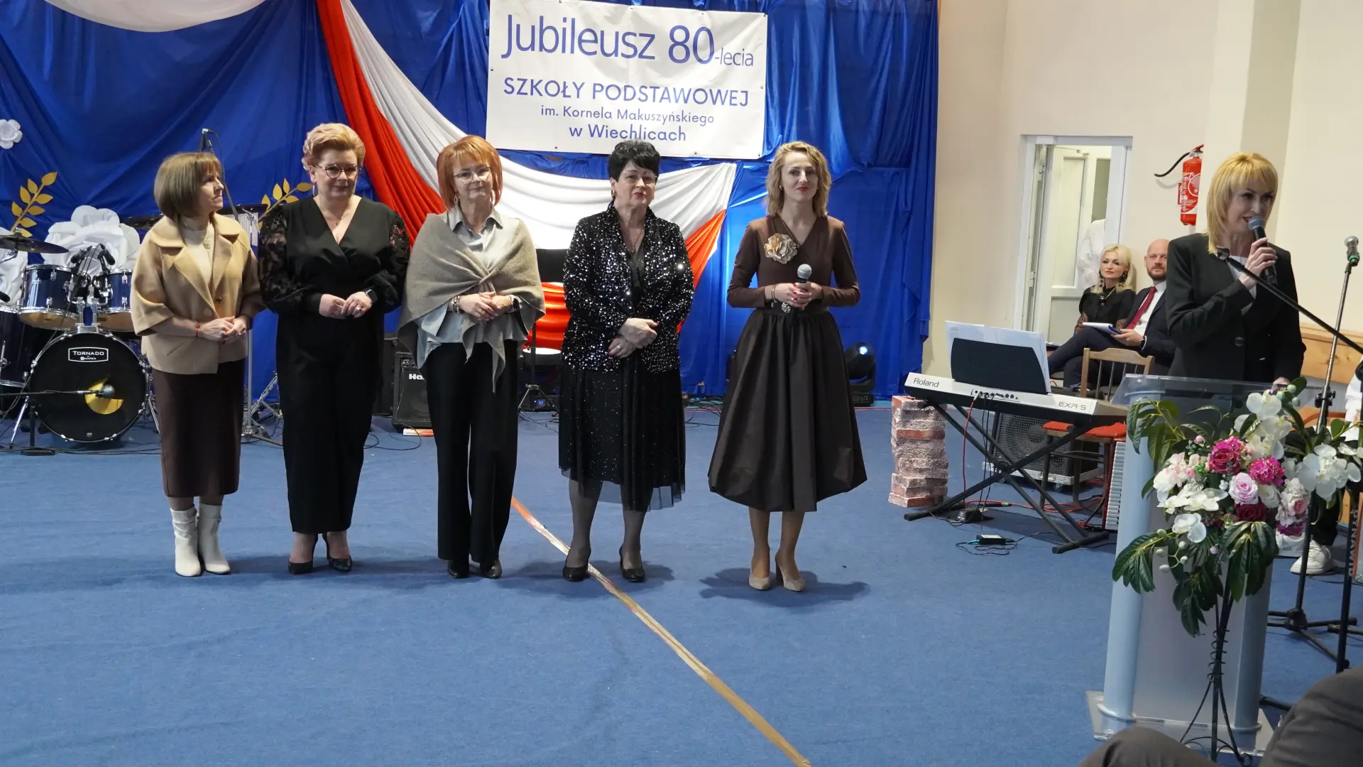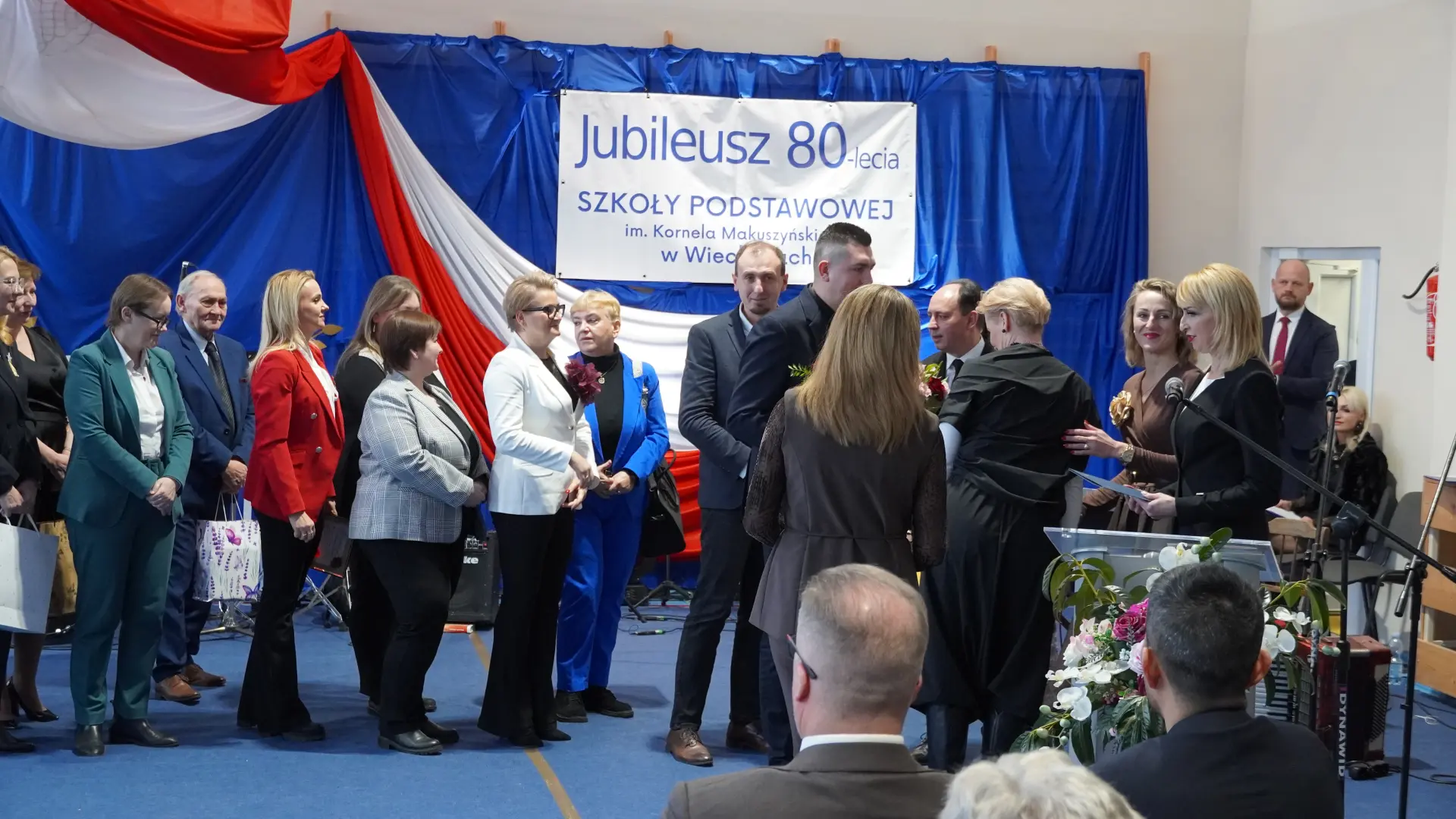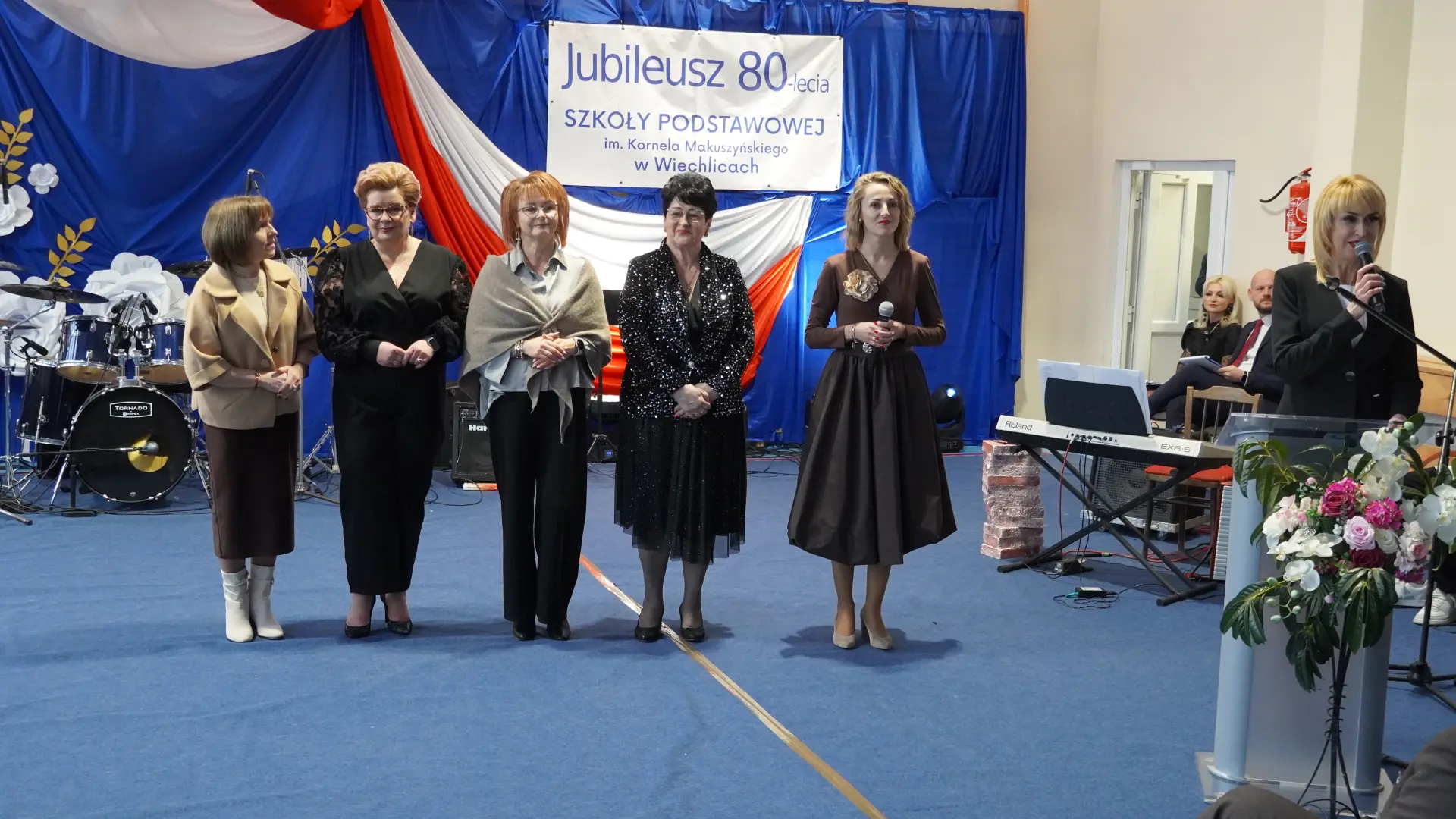 Uroczystość, która była niezwykłym przeżyciem dla nauczycieli, pracowników, emerytów, uczniów, absolwentów i rodziców uświetnili zaproszeni goście, od których na ręce dyrektora szkoły, Cecylii Brodzińskiej, popłynęły życzenia i gratulacje. Swoją obecnością zaszczycili nas m.in. P. Mirosław Gąsik- burmistrz Szprotawy, P. Dorota Grzeszczak - wiceburmistrz Szprotawy, p. Halina Sawa- wiceprzewodnicząca Rady Miejskiej w Szprotawie, p. Stanisław Tomczyszyn - Poseł na Sejm RP, p. Maciej Siwivki - I Wicewojewoda Lubuski, p. Marzena Pulik - Sowińska - Lubuski Wicekurator Oświaty, p. Paweł Giza - Radny Sejmiku Województwa Lubuskiego. Dyrektor w swoim przemówieniu zwróciła się do byłych pracowników i nauczycieli, byłej kadry kierowniczej, absolwentów, uczniów, rodziców, pracowników i nauczycieli aktualnie pracujących, dziękując za ogromny wysiłek na przestrzeni lat, ale także za wszystkie osiągnięcia. Podziękowała również Panu i Pani Burmistrz, Kuratorium Oświaty, samorządowcom, przyjaciołom szkoły i wszystkim instytucjom wspierającym naszą placówkę. W imieniu absolwentów do zebranych zwróciła się P. Sylwia Suszko - absolwentka, a obecnie wicedyrektor szkoły. Ale najbardziej serca wszystkich zostały poruszone przez muzykę. Prowadzący galę – p. Anna Ciołka oraz p. Jacek Druciarek, podzielili historię szkoły na dekady począwszy od lat pięćdziesiątych. W każdej z nich prezentowane były utwory muzyczne typowe dla danego okresu. Wybrzmiały więc: ” Krakowski splean”, „Budujemy nowy most”, „Kroplą deszczu”, Metalica”, „Zawsze niech będzie słońce” czy „Barka”. Oprawę muzyczną gali zapewnił p. Krzysztof Boczniewicz wraz z prowadzonym przez niego zespołem „ZRZ” składającym się z uczniów i naszych absolwentów oraz z zespołem muzycznym istniejącym obecnie w szkole. Podczas uroczystości było kilka niespodzianek. Zaskoczeniem było spontaniczne zaśpiewanie przez byłych członków zespołu „Fajna Ferajna” oraz członków innych grup muzycznych działających na przestrzeni lat w SP Wiechlice utworu „Z tamtej strony jeziora”, wtapianie się strojem w poszczególne dekady przez prowadzącą uroczystość oraz poprowadzenie części gali przez p. Macieja Siwickiego, nauczyciela szkoły, a obecnie I Wicewojewody Lubuskiego.