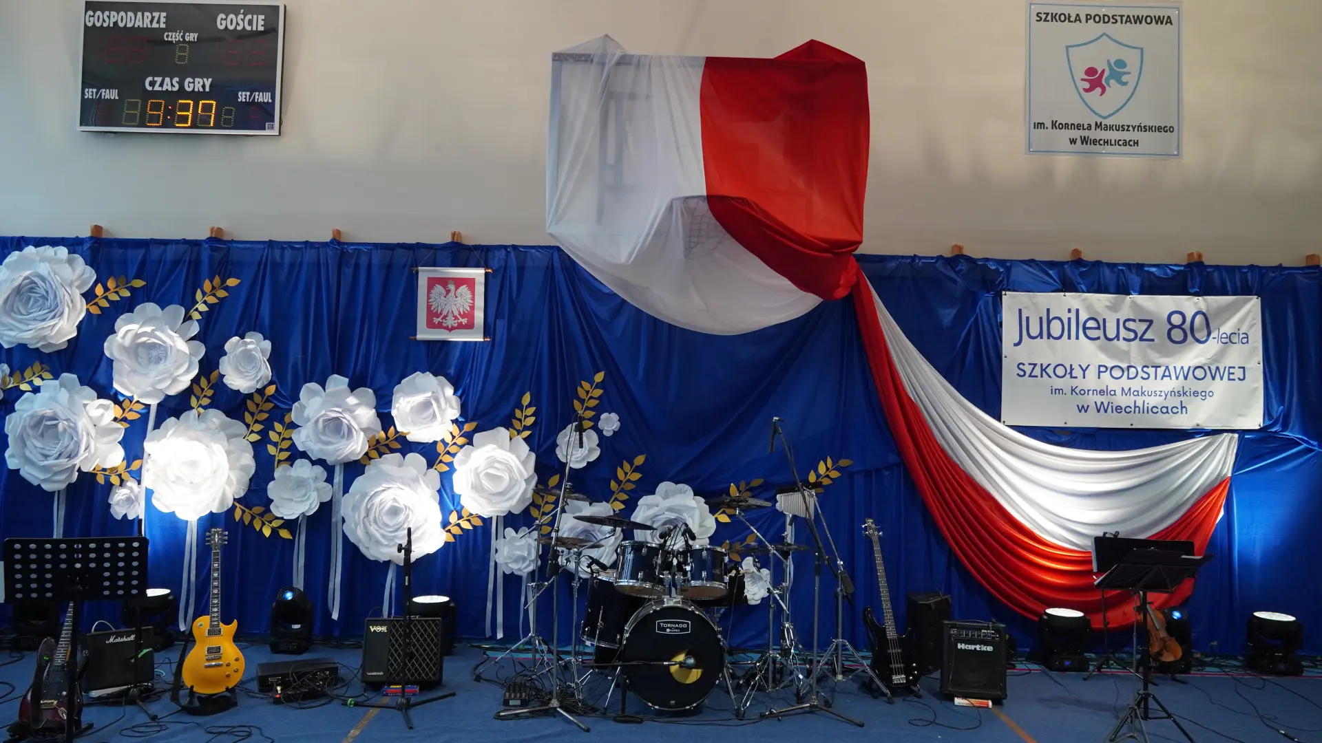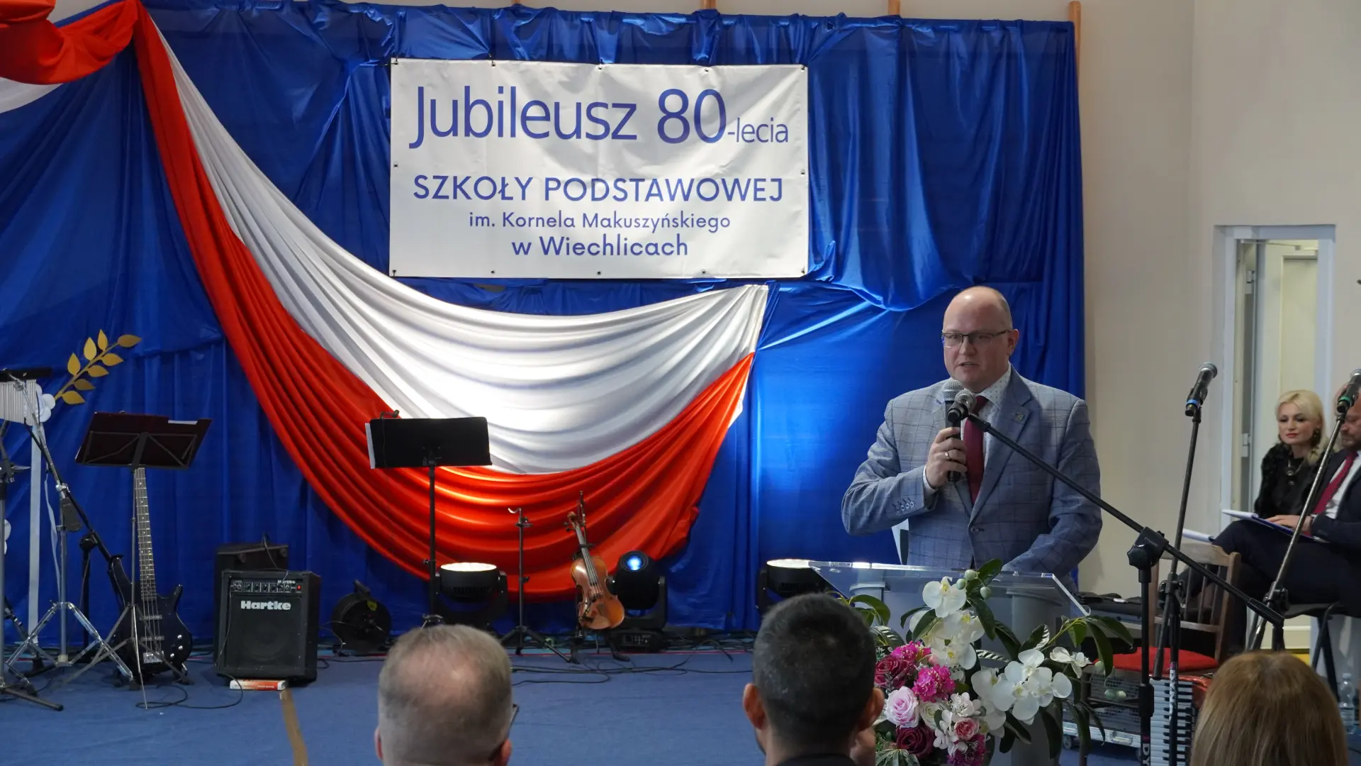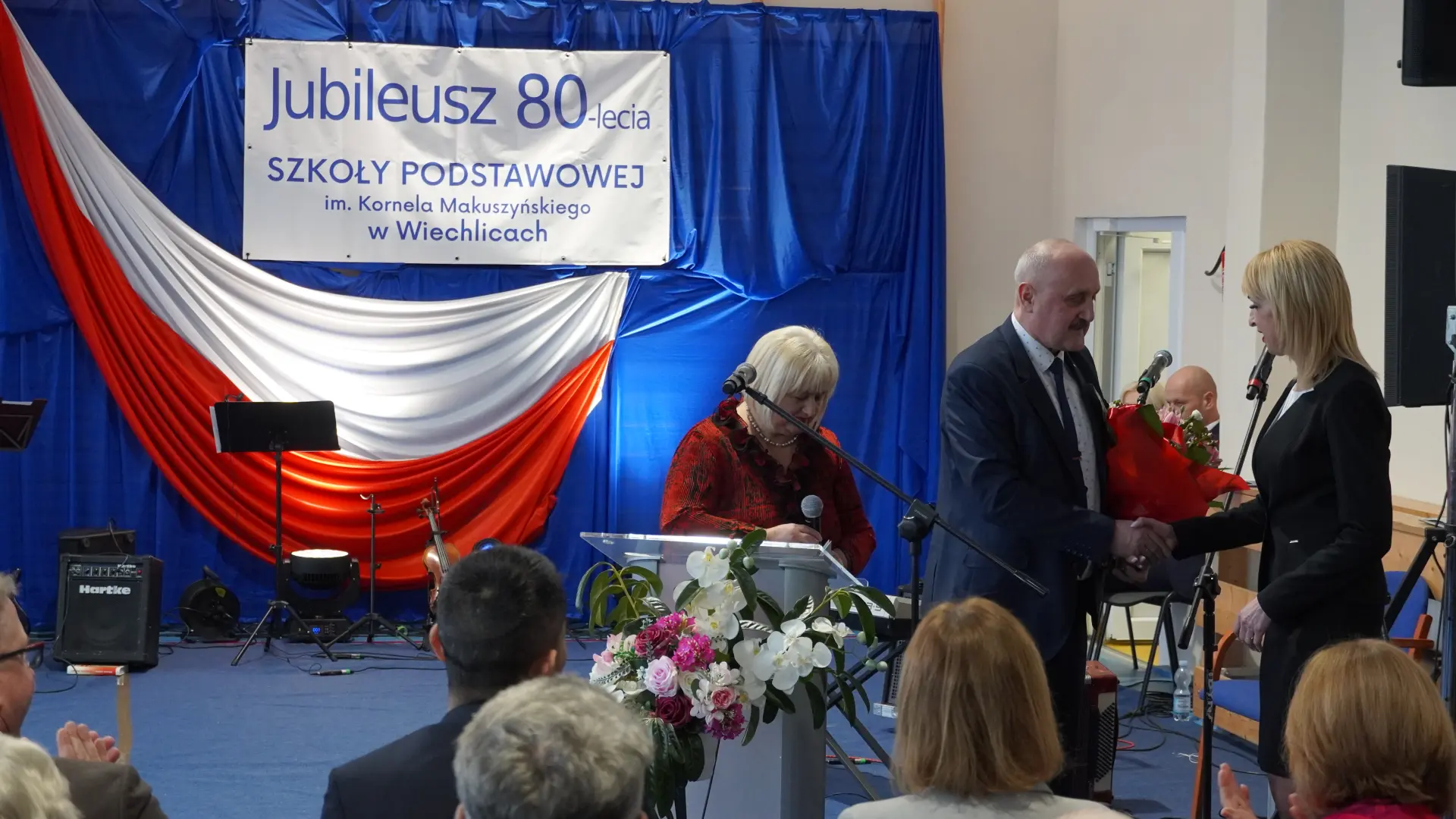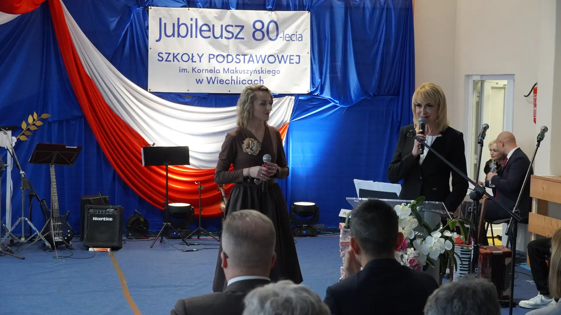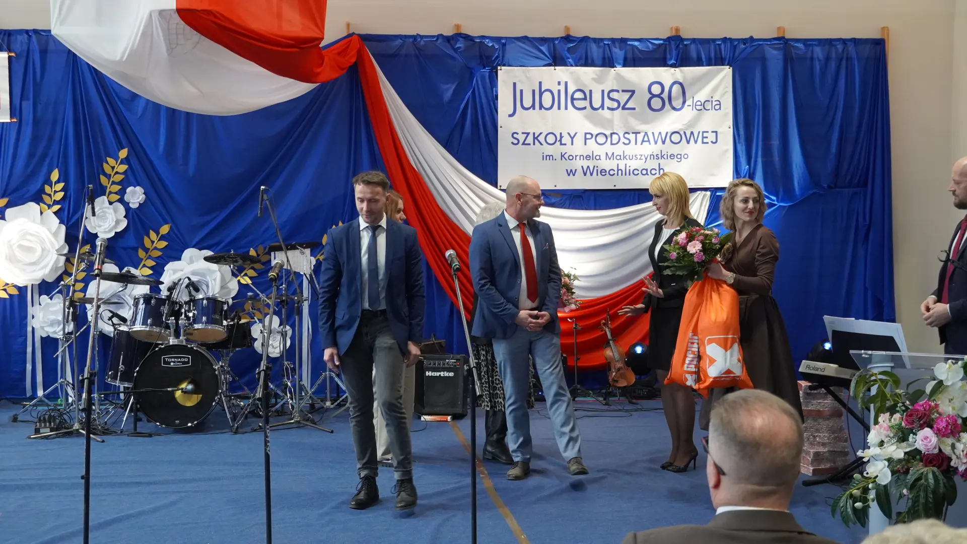 Uroczystość, która była niezwykłym przeżyciem dla nauczycieli, pracowników, emerytów, uczniów, absolwentów i rodziców uświetnili zaproszeni goście, od których na ręce dyrektora szkoły, Cecylii Brodzińskiej, popłynęły życzenia i gratulacje. Swoją obecnością zaszczycili nas m.in. P. Mirosław Gąsik- burmistrz Szprotawy, P. Dorota Grzeszczak - wiceburmistrz Szprotawy, p. Halina Sawa- wiceprzewodnicząca Rady Miejskiej w Szprotawie, p. Stanisław Tomczyszyn - Poseł na Sejm RP, p. Maciej Siwivki - I Wicewojewoda Lubuski, p. Marzena Pulik - Sowińska - Lubuski Wicekurator Oświaty, p. Paweł Giza - Radny Sejmiku Województwa Lubuskiego. Dyrektor w swoim przemówieniu zwróciła się do byłych pracowników i nauczycieli, byłej kadry kierowniczej, absolwentów, uczniów, rodziców, pracowników i nauczycieli aktualnie pracujących, dziękując za ogromny wysiłek na przestrzeni lat, ale także za wszystkie osiągnięcia. Podziękowała również Panu i Pani Burmistrz, Kuratorium Oświaty, samorządowcom, przyjaciołom szkoły i wszystkim instytucjom wspierającym naszą placówkę. W imieniu absolwentów do zebranych zwróciła się P. Sylwia Suszko - absolwentka, a obecnie wicedyrektor szkoły. Ale najbardziej serca wszystkich zostały poruszone przez muzykę. Prowadzący galę – p. Anna Ciołka oraz p. Jacek Druciarek, podzielili historię szkoły na dekady począwszy od lat pięćdziesiątych. W każdej z nich prezentowane były utwory muzyczne typowe dla danego okresu. Wybrzmiały więc: ” Krakowski splean”, „Budujemy nowy most”, „Kroplą deszczu”, Metalica”, „Zawsze niech będzie słońce” czy „Barka”. Oprawę muzyczną gali zapewnił p. Krzysztof Boczniewicz wraz z prowadzonym przez niego zespołem „ZRZ” składającym się z uczniów i naszych absolwentów oraz z zespołem muzycznym istniejącym obecnie w szkole. Podczas uroczystości było kilka niespodzianek. Zaskoczeniem było spontaniczne zaśpiewanie przez byłych członków zespołu „Fajna Ferajna” oraz członków innych grup muzycznych działających na przestrzeni lat w SP Wiechlice utworu „Z tamtej strony jeziora”, wtapianie się strojem w poszczególne dekady przez prowadzącą uroczystość oraz poprowadzenie części gali przez p. Macieja Siwickiego, nauczyciela szkoły, a obecnie I Wicewojewody Lubuskiego.