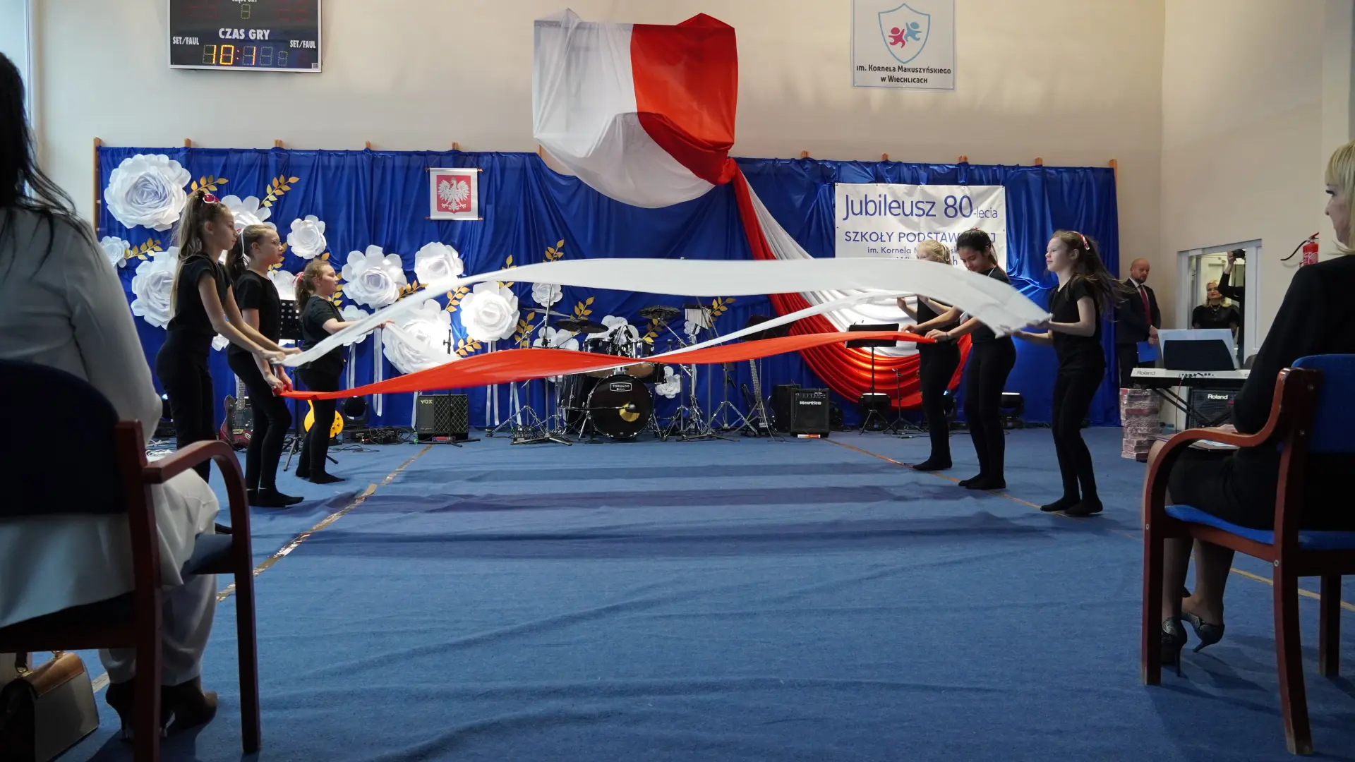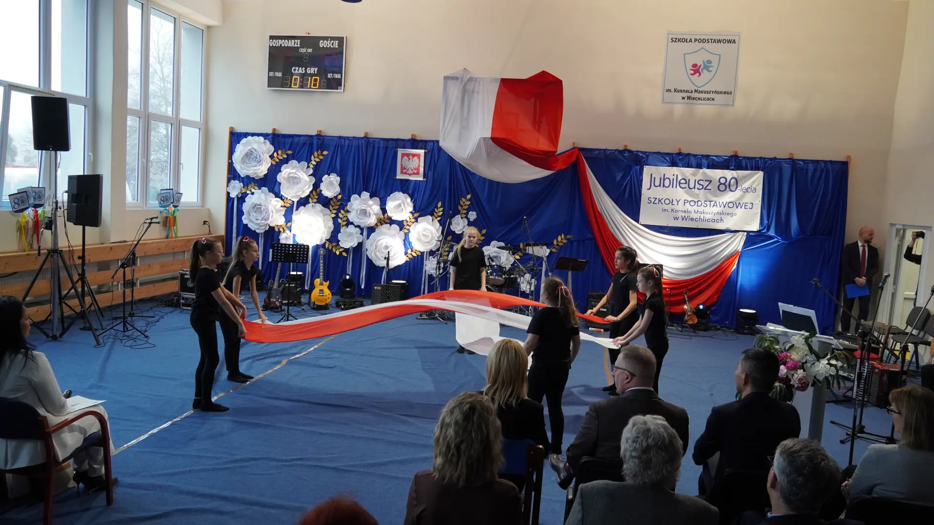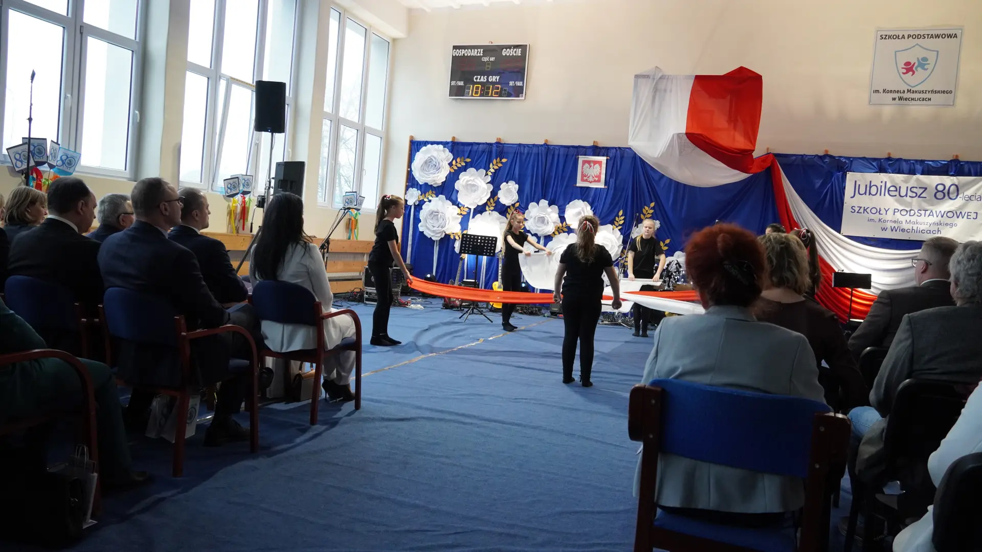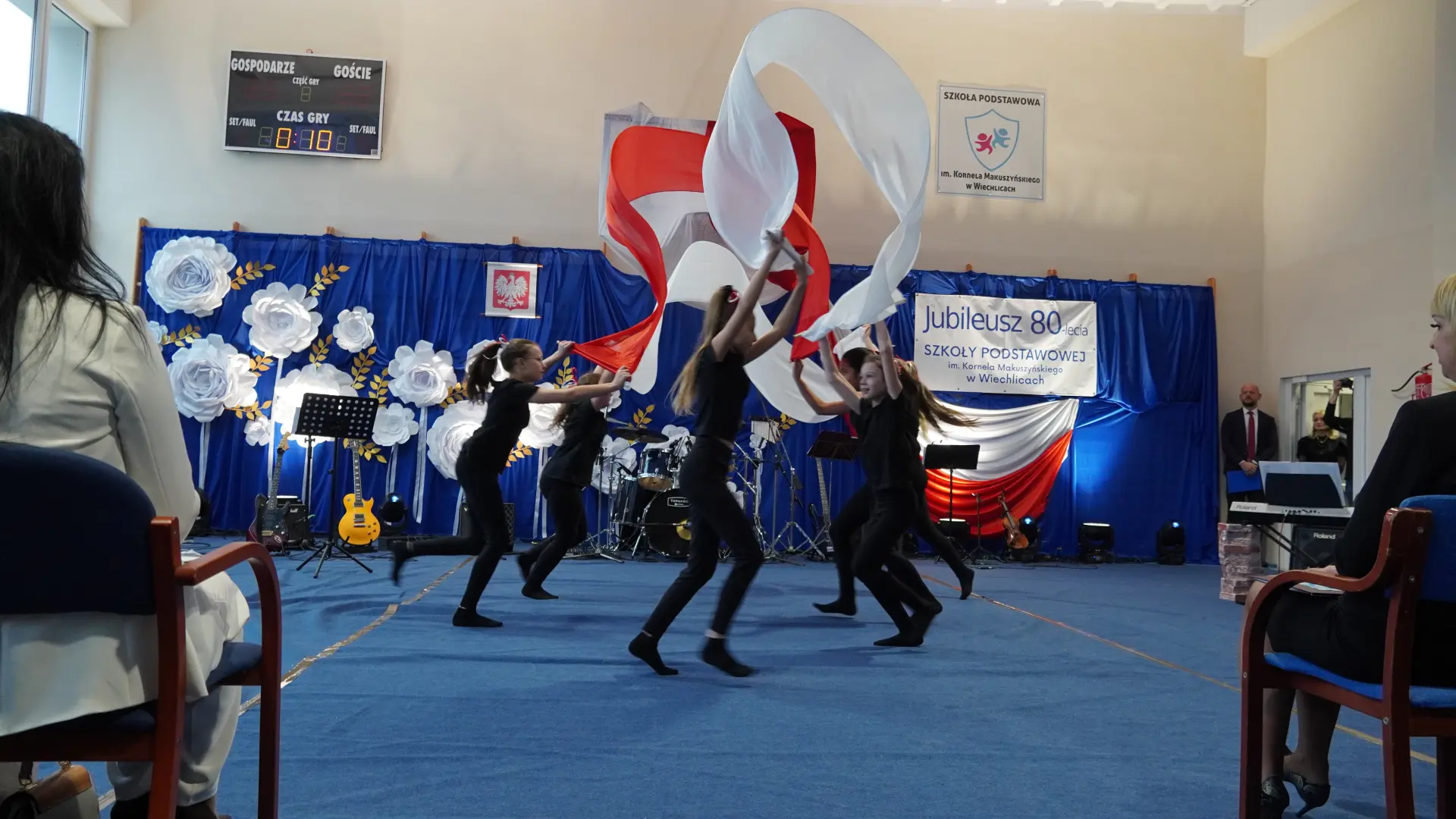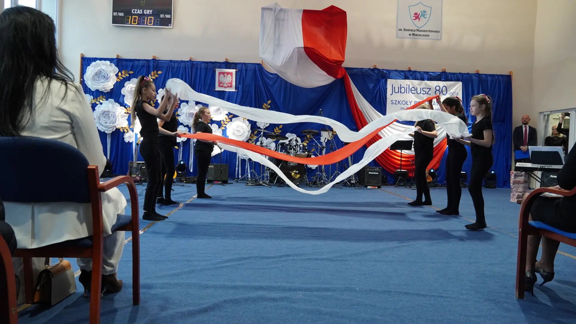 W uświetnieniu jubileuszu wzięły też udział maluszki z grupy przedszkolnej, które przypomniały charakterystyczne dla lat siedemdziesiątych wiersze oraz czwartoklasistki, które dostarczyły niezwykłych wrażeń „Tańcem flagi”.