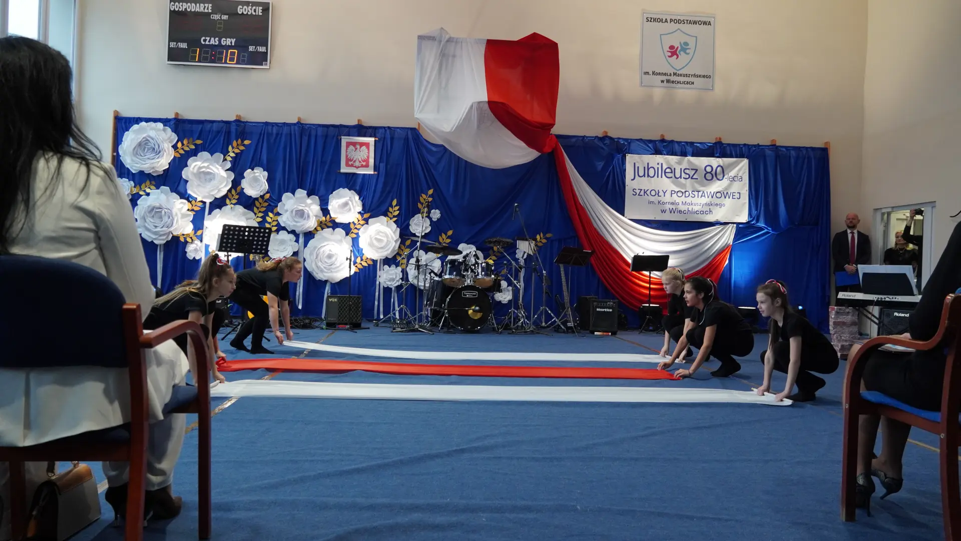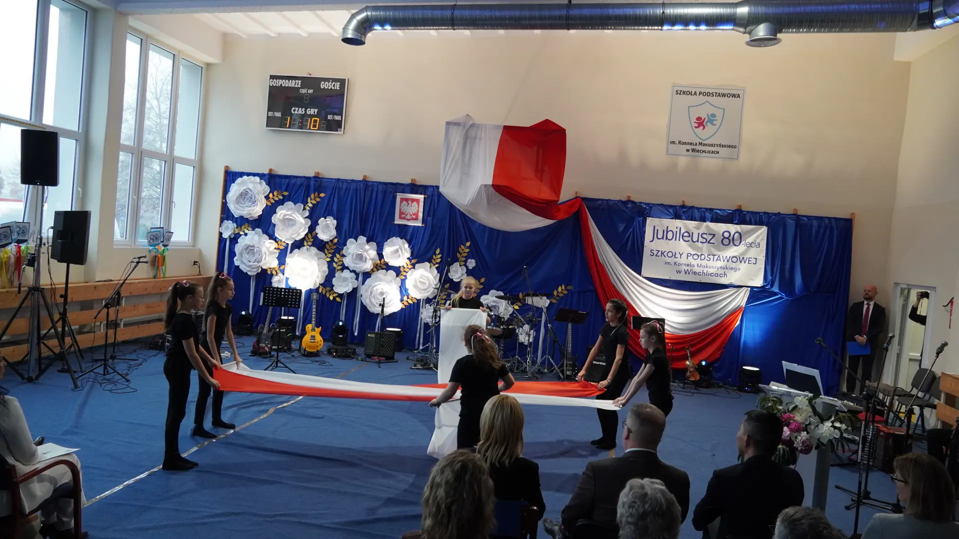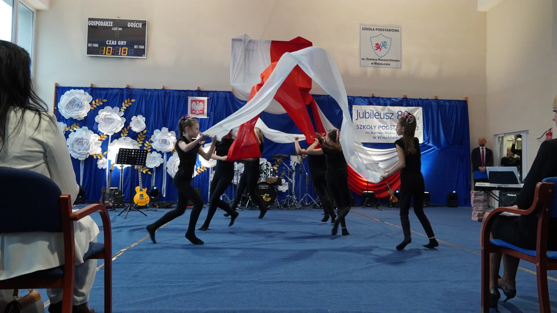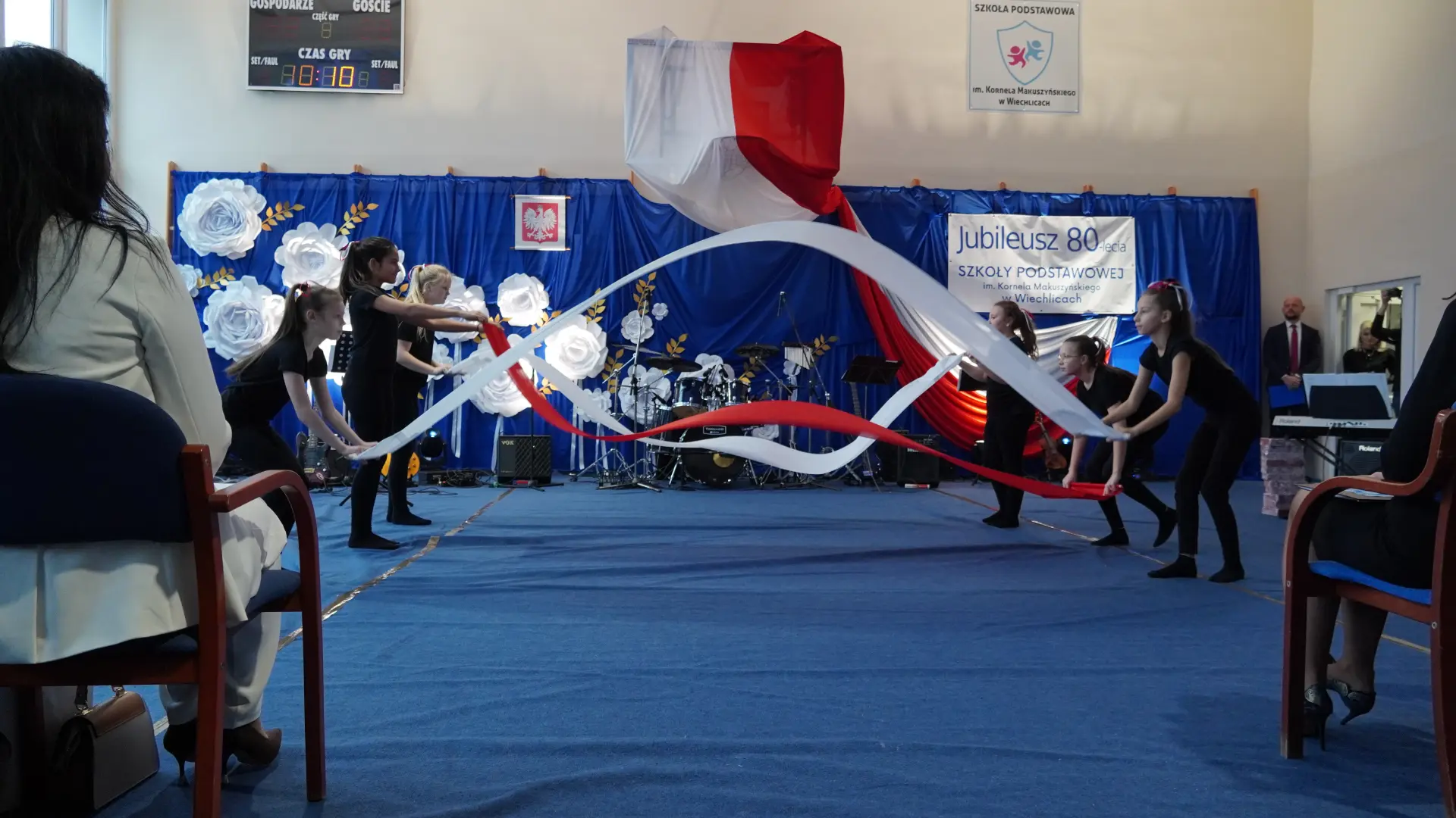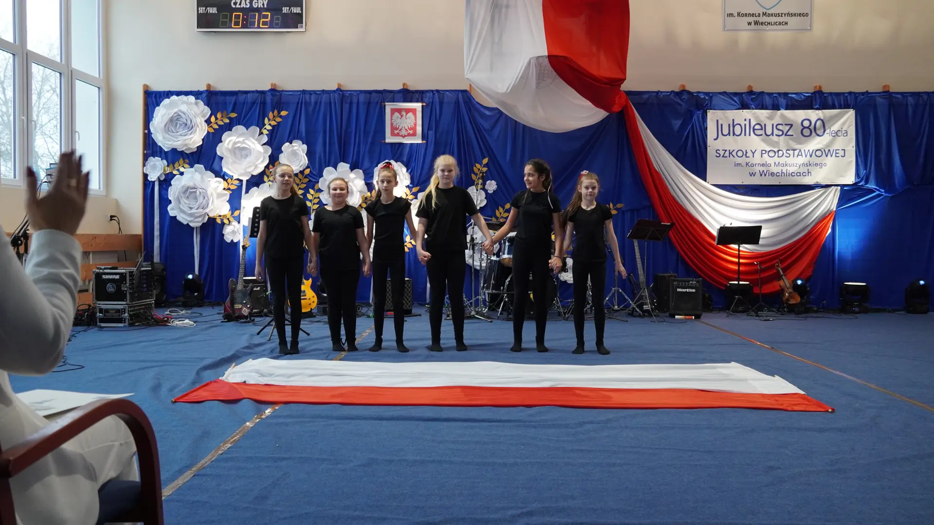 W uświetnieniu jubileuszu wzięły też udział maluszki z grupy przedszkolnej, które przypomniały charakterystyczne dla lat siedemdziesiątych wiersze oraz czwartoklasistki, które dostarczyły niezwykłych wrażeń „Tańcem flagi”.
