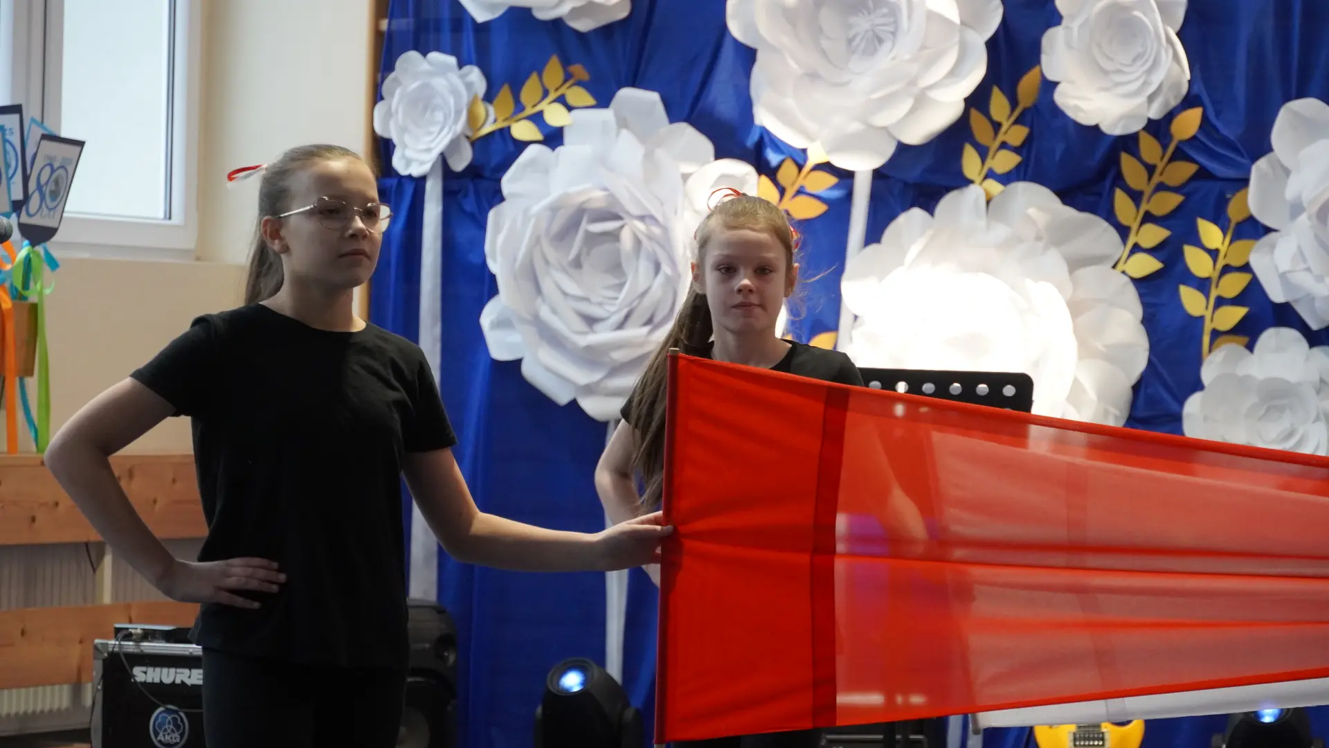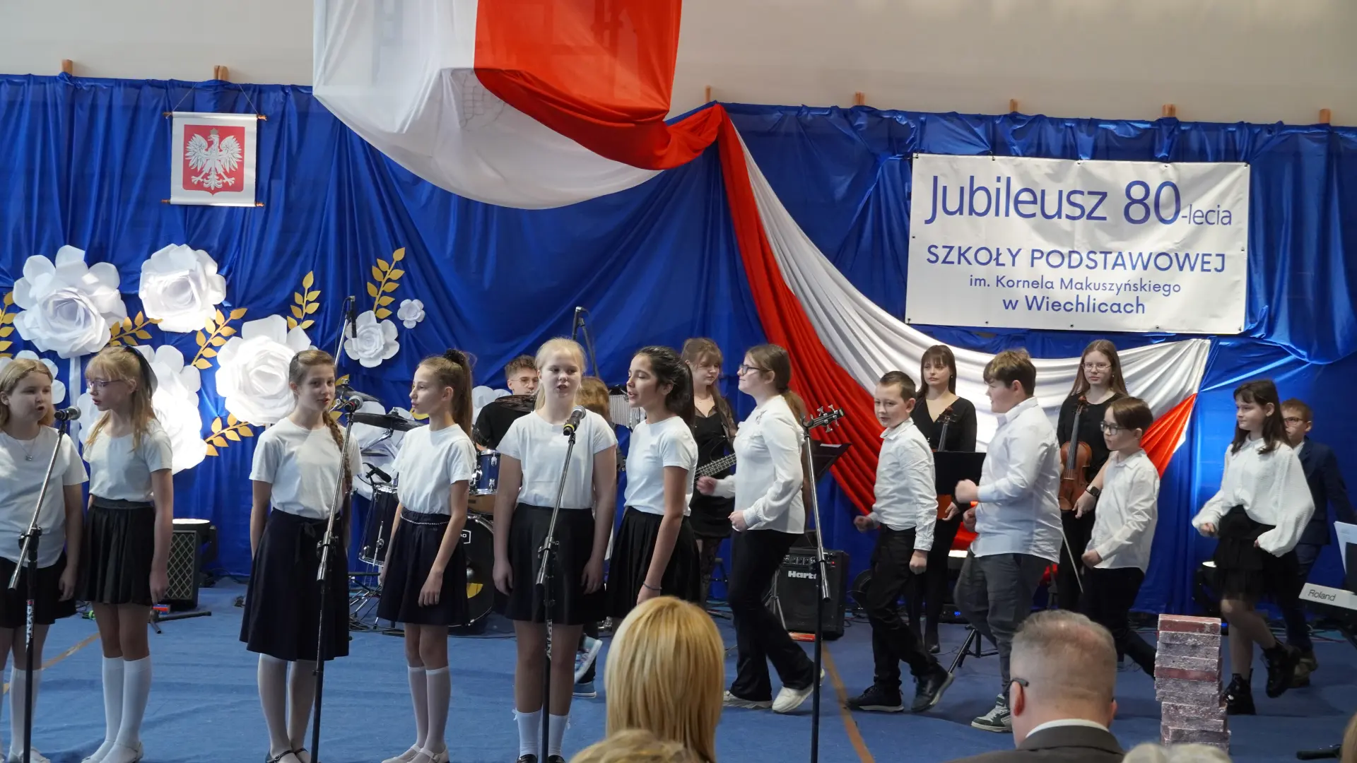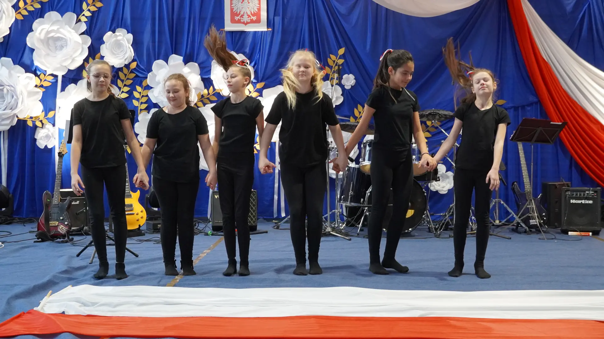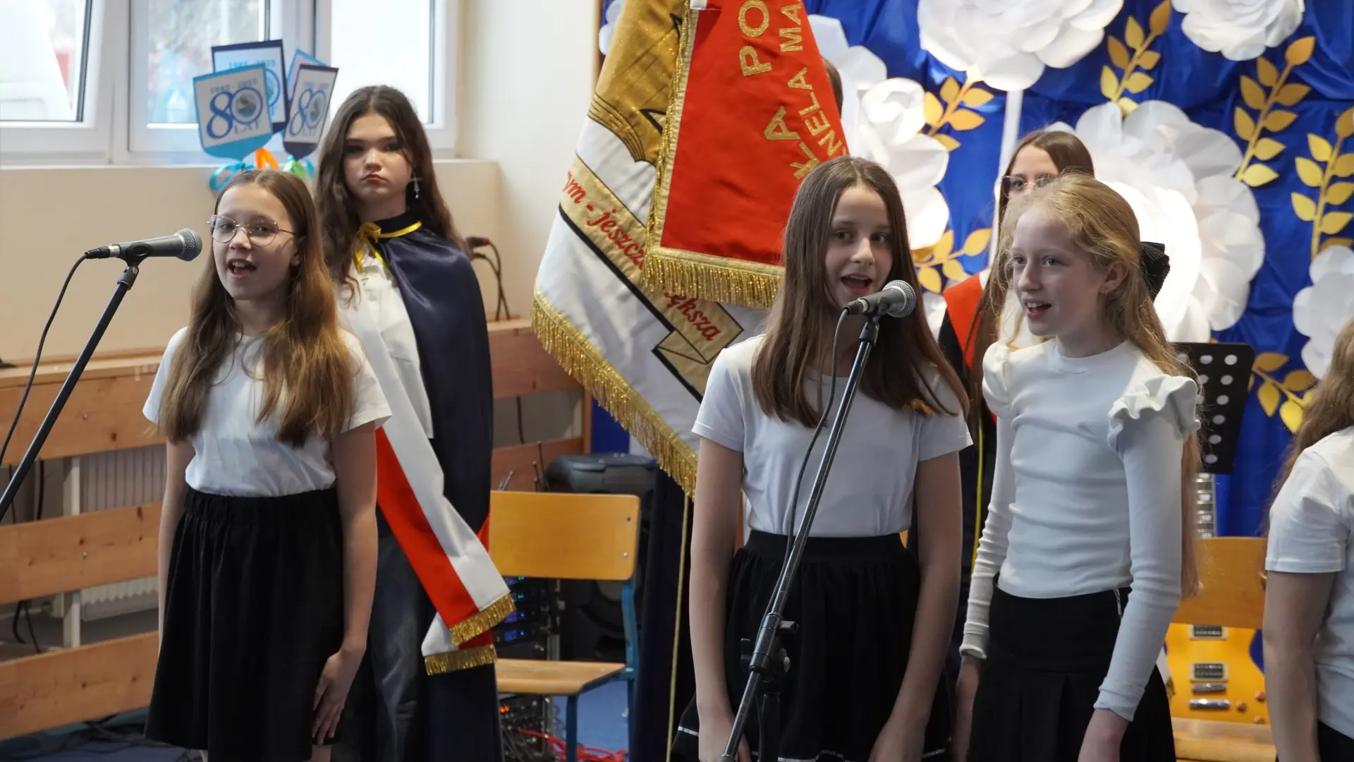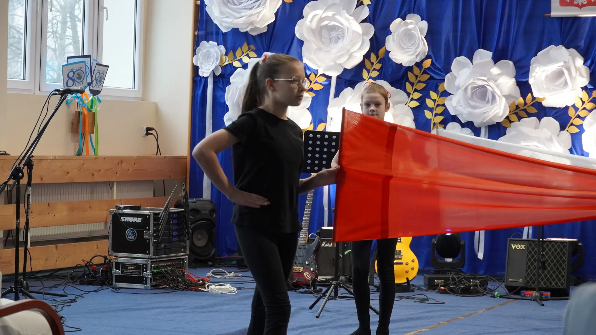 W uświetnieniu jubileuszu wzięły też udział maluszki z grupy przedszkolnej, które przypomniały charakterystyczne dla lat siedemdziesiątych wiersze oraz czwartoklasistki, które dostarczyły niezwykłych wrażeń „Tańcem flagi”.