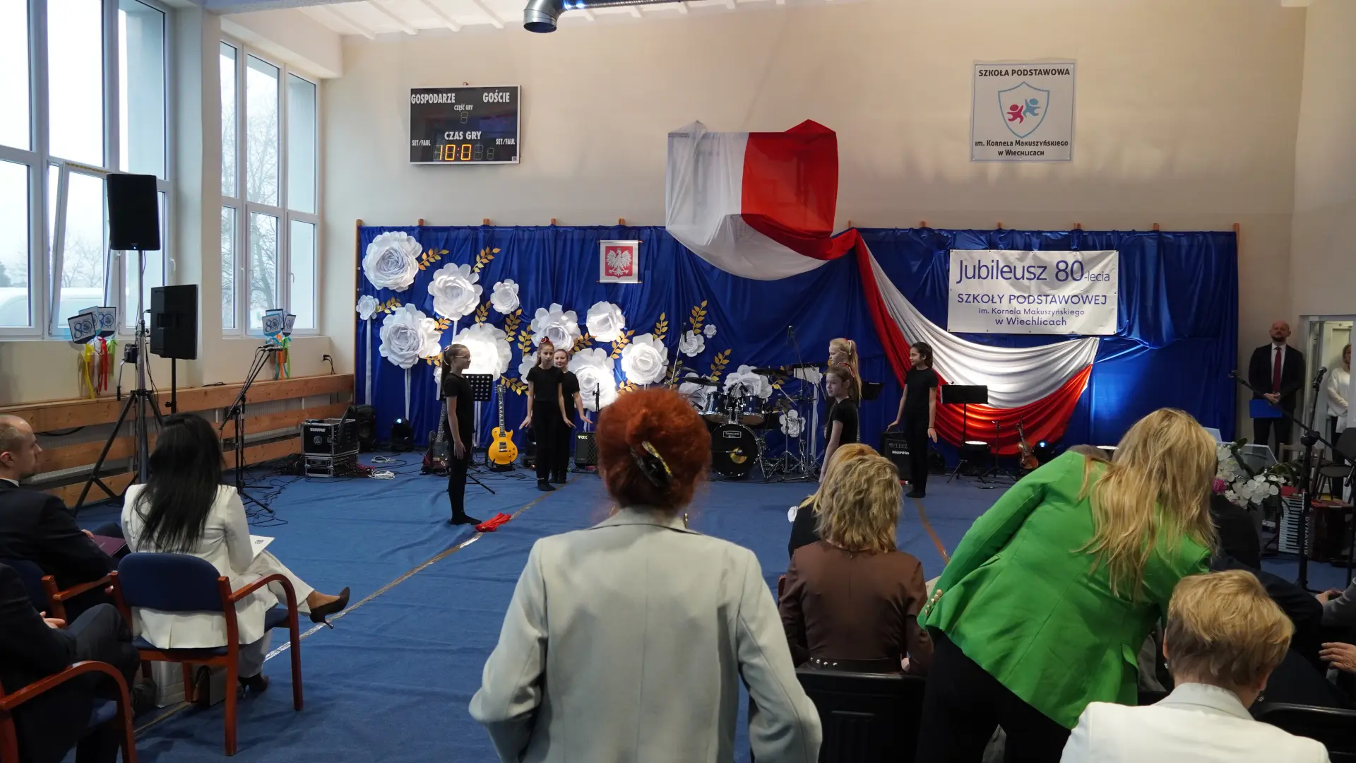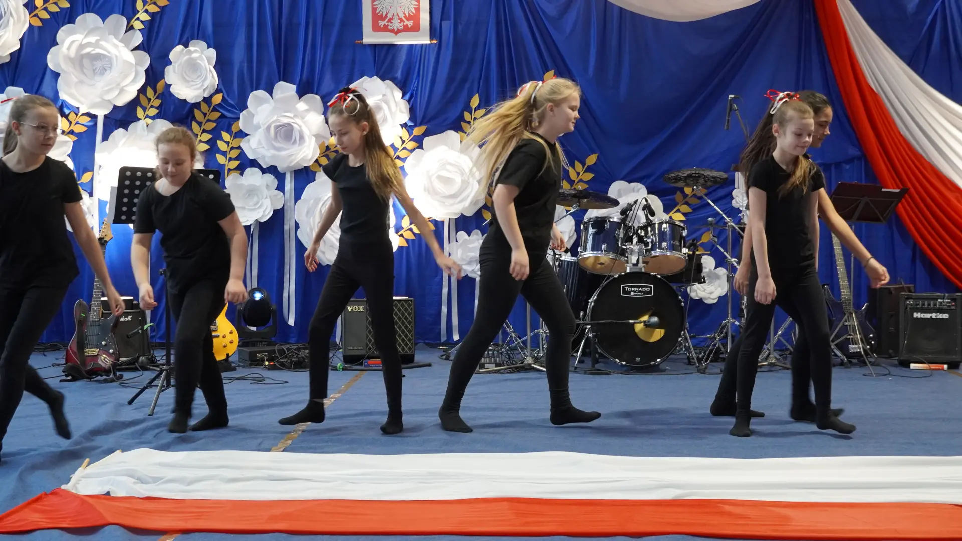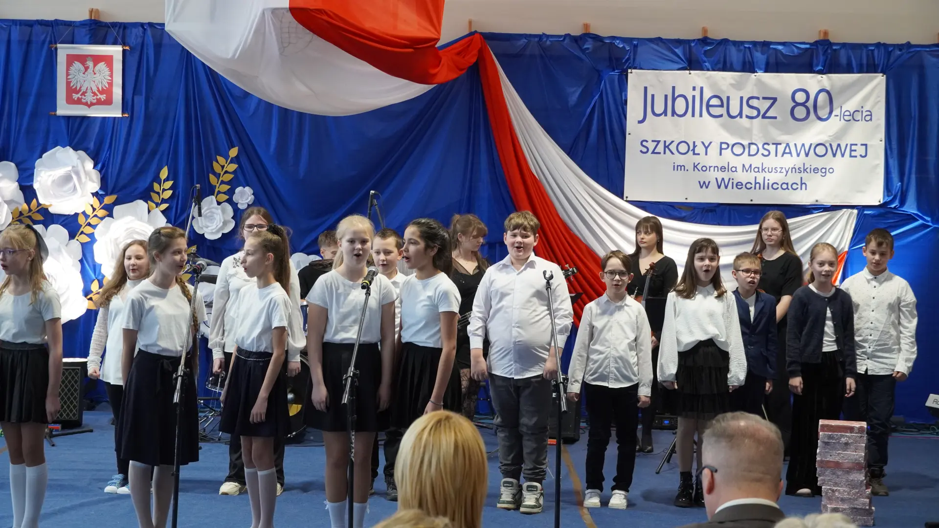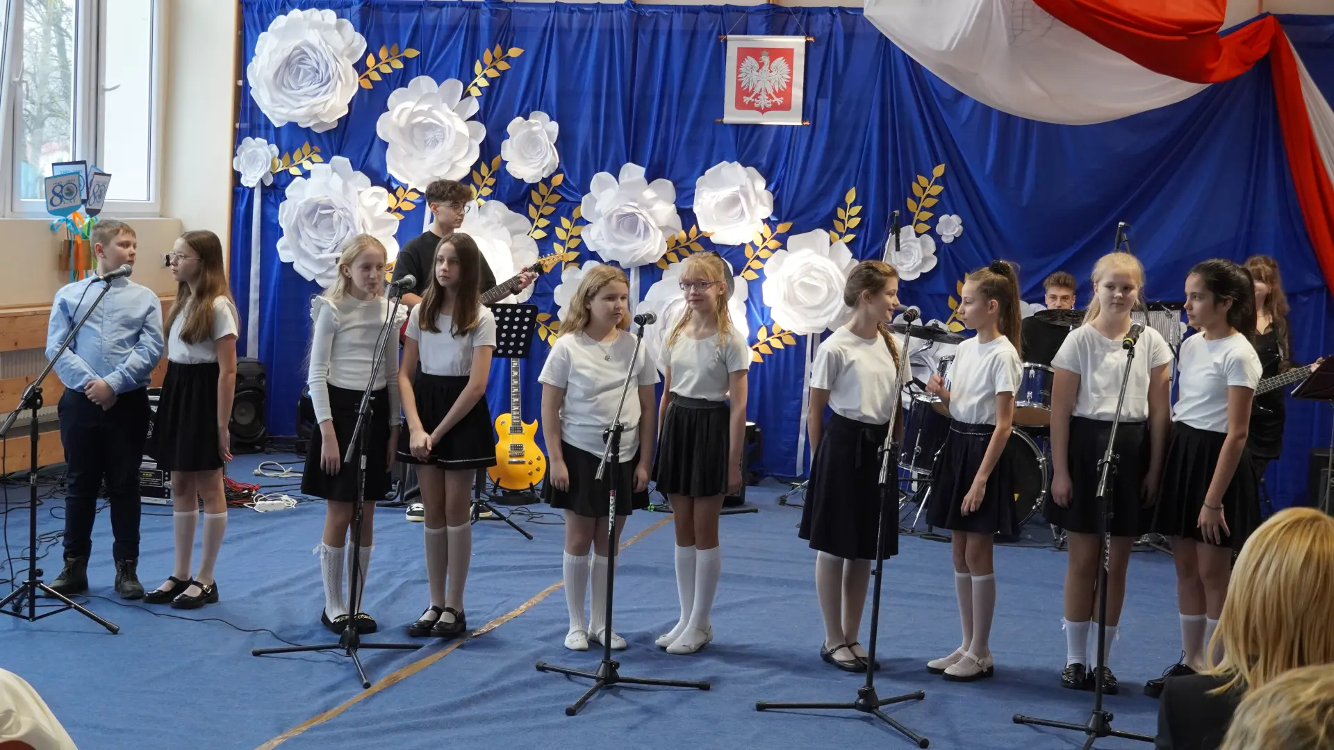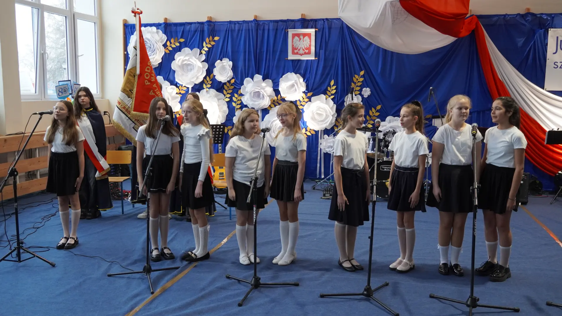W uświetnieniu jubileuszu wzięły też udział maluszki z grupy przedszkolnej, które przypomniały charakterystyczne dla lat siedemdziesiątych wiersze oraz czwartoklasistki, które dostarczyły niezwykłych wrażeń „Tańcem flagi”.