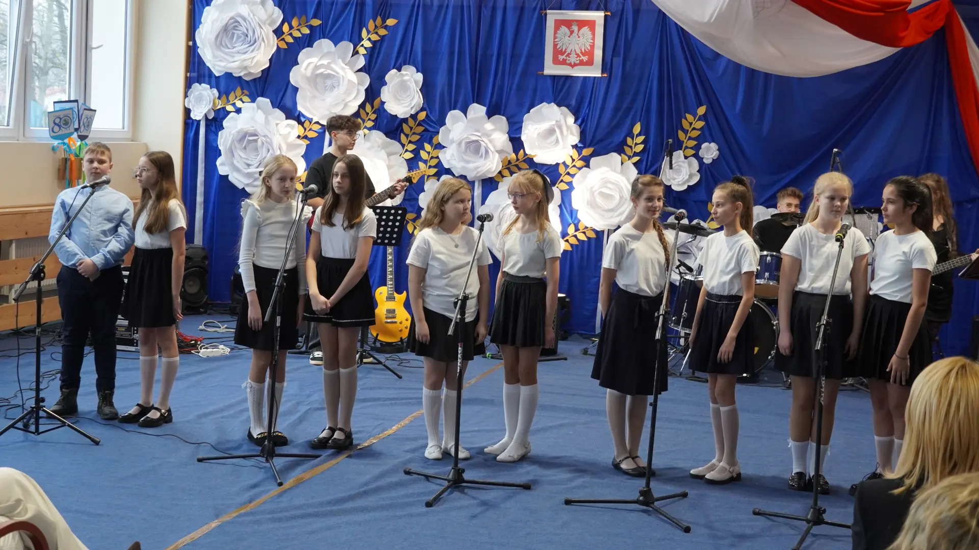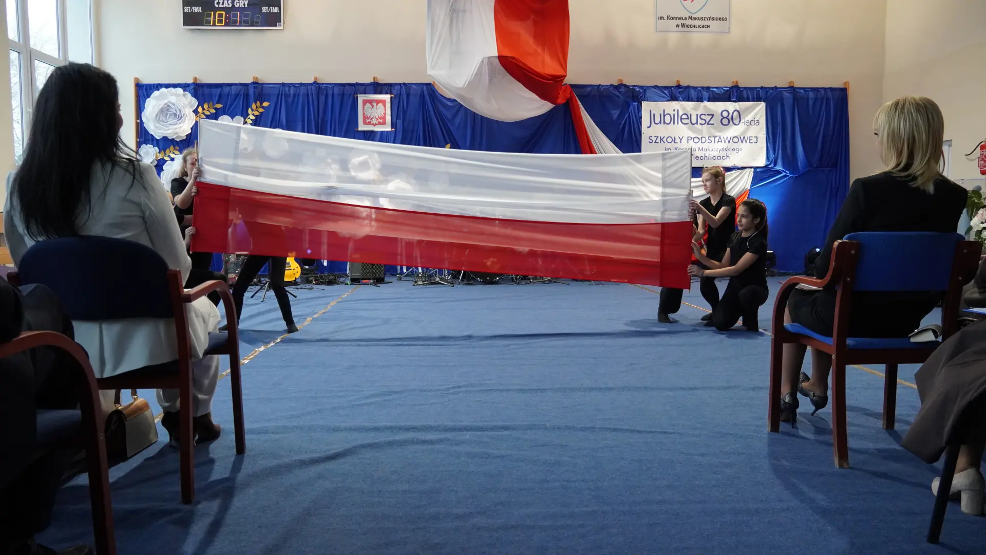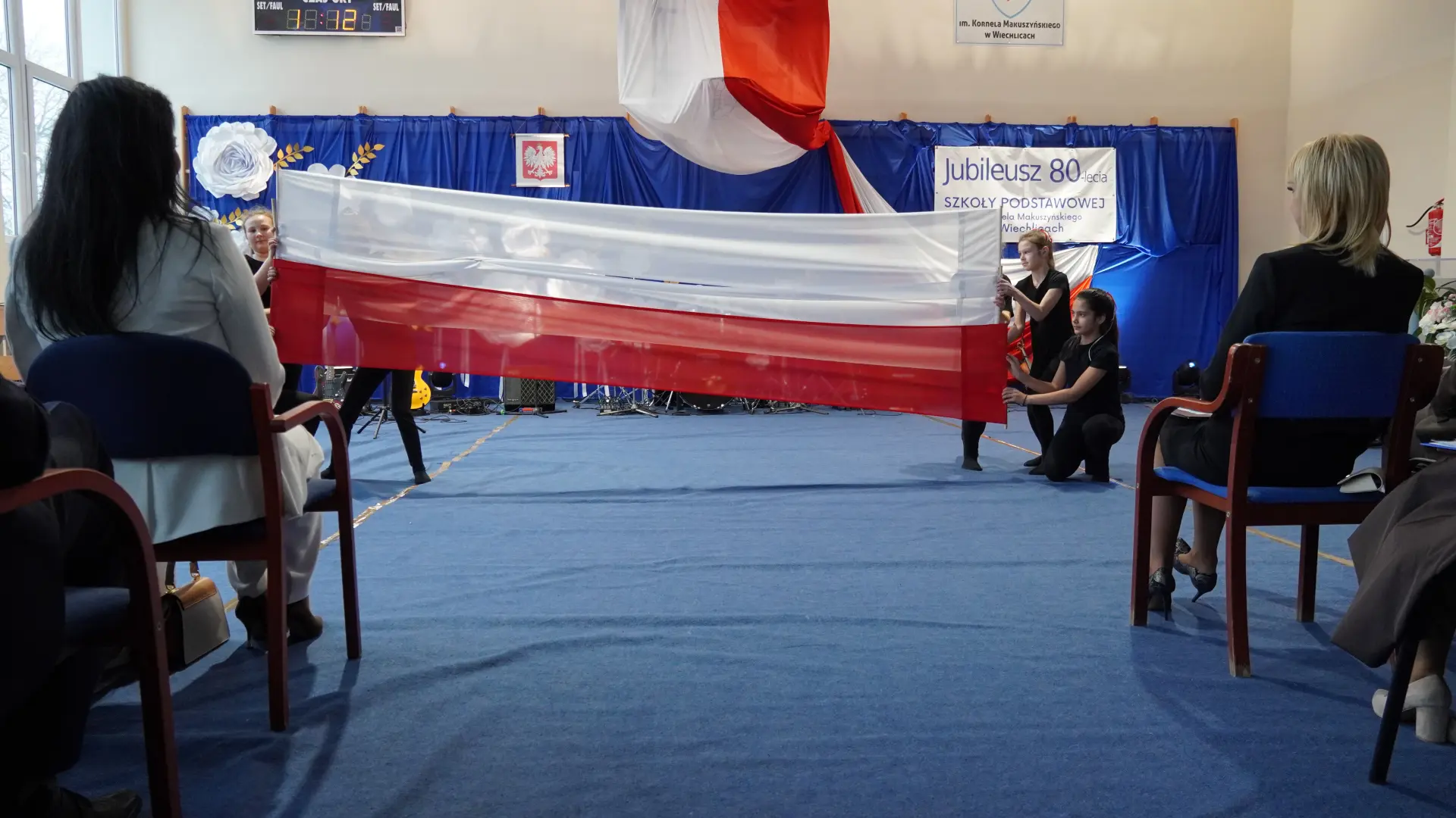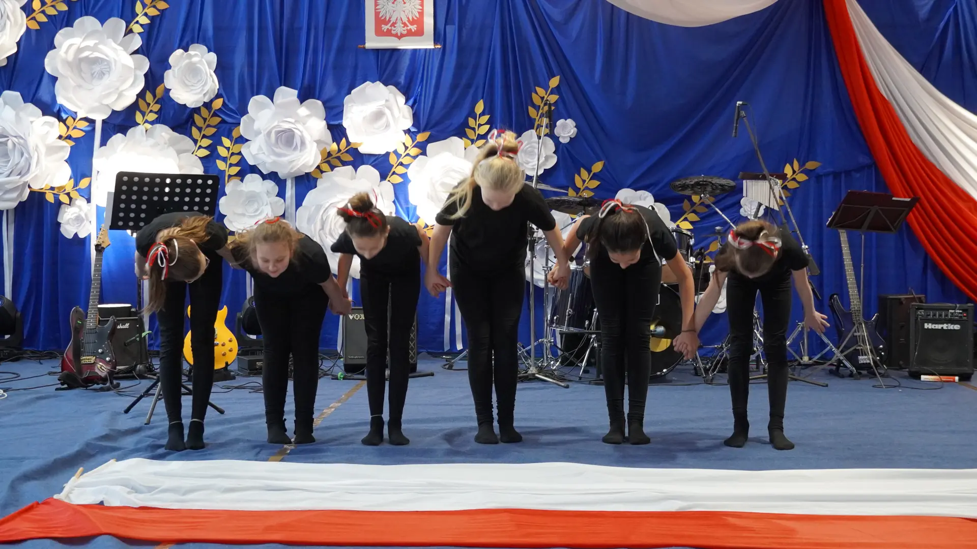 W uświetnieniu jubileuszu wzięły też udział maluszki z grupy przedszkolnej, które przypomniały charakterystyczne dla lat siedemdziesiątych wiersze oraz czwartoklasistki, które dostarczyły niezwykłych wrażeń „Tańcem flagi”.